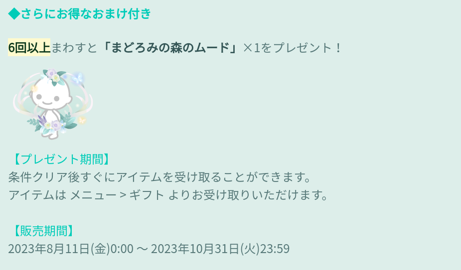 おまけ内容では有料も無料もどちらの連ガチャでも初回で貰う事が出来るムードという点ではおまけとしては〇だと思うんだけど~実際に着用点数の上限が10点しか身に着けれないのにムード自体に回す余裕がなくなるのが現状なのを運営はもっと理解すべきだと思うし装着点数の上限を上げるなり単体のアバターの質をもっとあげるなりでどうにかしてもらいたいもんですねw