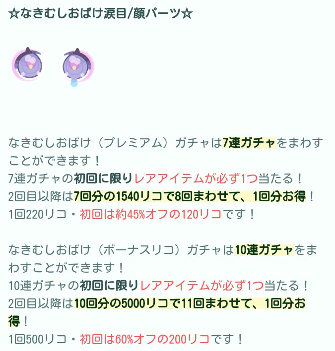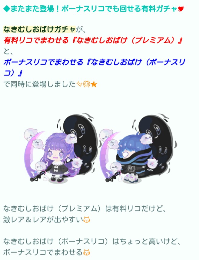 はいwでは今回は有料と無料内容が同時に登場され、尚且つ偏った内容ではなく純粋に有料でも無料でも回すことが出来るという「なきむしおばけ」ガチャが登場したので記録していきますね(^_-)-☆
