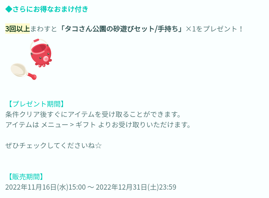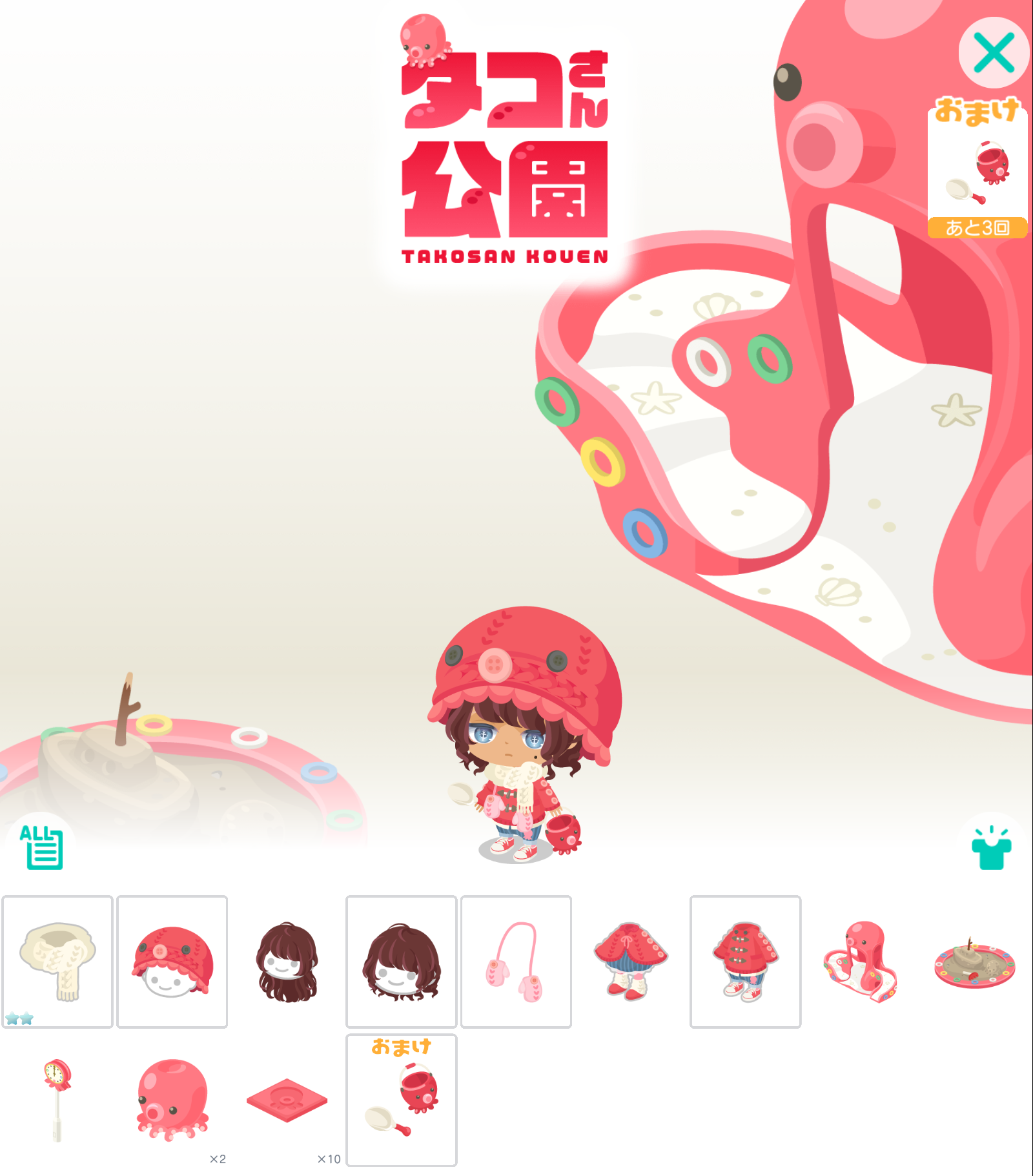 こちらでは低価格内容で無料リコ設定の中で小マシな内容の無料ガチャより「タコさん公園」が登場したので記録していきますね(^_-)-☆