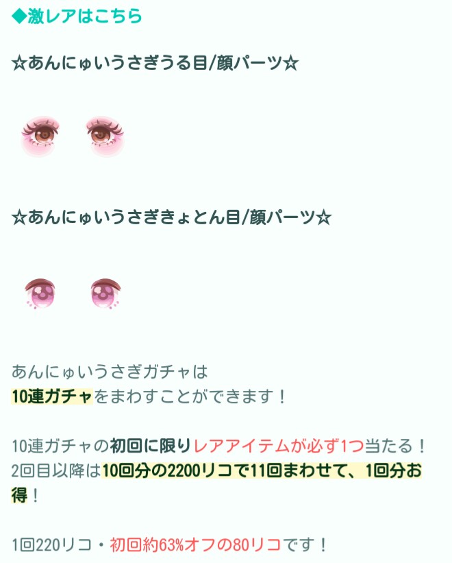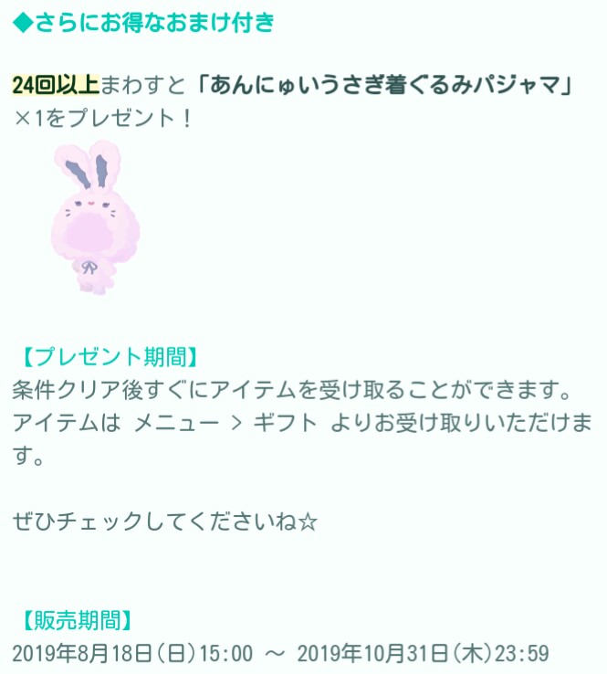 はいwでは今回はCPチケット対象ガチャも第8弾と、残り登場数の終わりが見えてきた中で今回の「あんにゅいうさぎ」ガチャが登場したので記録していきますね(^_-)-☆