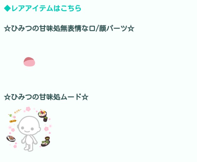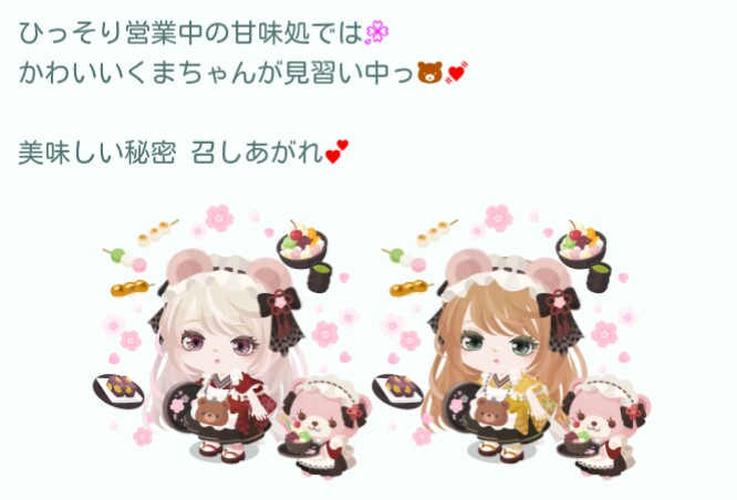 はいwでは今回は毎年春になると同じネタをぶっこんで来るピグパより無料ガチャから「ひみつの甘味処」が登場したので記録していきますね(^_-)-☆