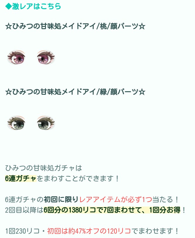さらに贅沢言うと、こうかん機能をフル活用するためにこちらの目を2つ所持出来たら自分の欲しい目のこうかん材料になるんではないかと思うので奇跡を起こして初回6連で目を2つ当てましょう((´∀`*))ヶラヶラ