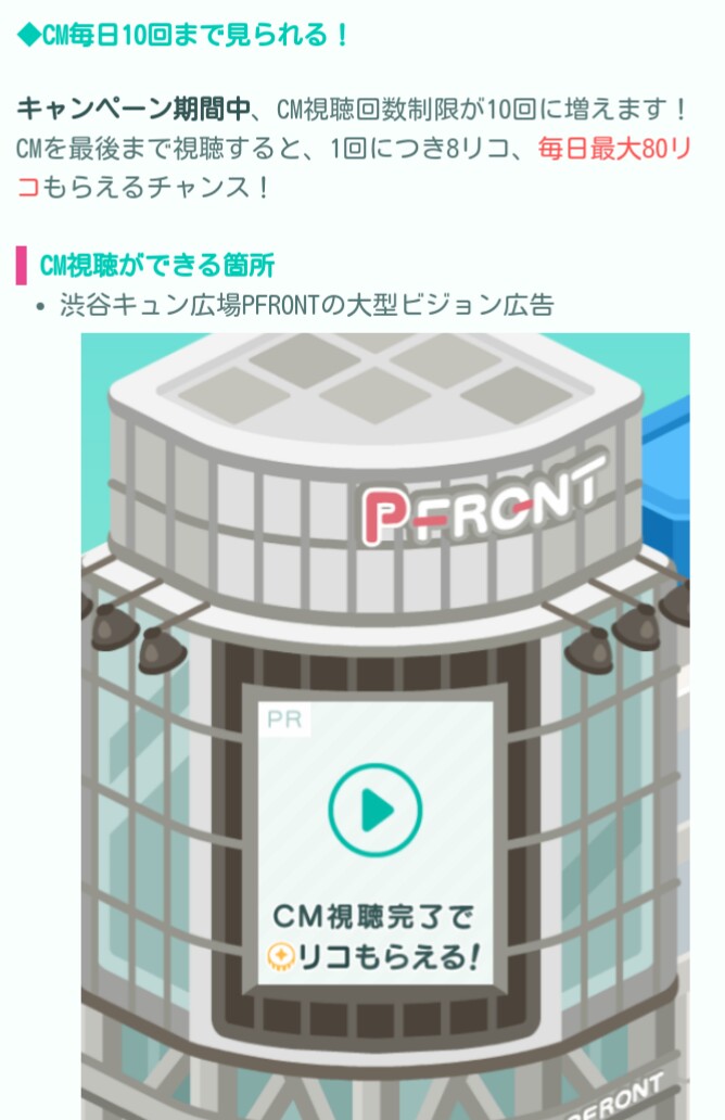 普段は画面下の「メニュー」→「CM視聴画像タップ」→「視聴からのリコ(σ・∀・)σゲッツ!!」で済むんですが、こういったCM視聴回数増大しているイベントって変なバグが多く、上手くCMが見れなかったり、「回数がまだ残っているのにすでに視聴回数が~…」とかなるんでそういったところをしっかりと改善すべきことが先なんじゃない?って思ったのはダデェだけじゃないはずw(ΦωΦ)シランケドw