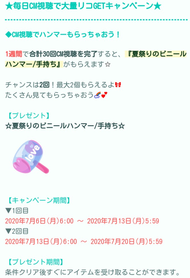 こちらではCM視聴することで貰える夏定番のアイテムの配布イベントとなっています(=゚ω゚)ノ
