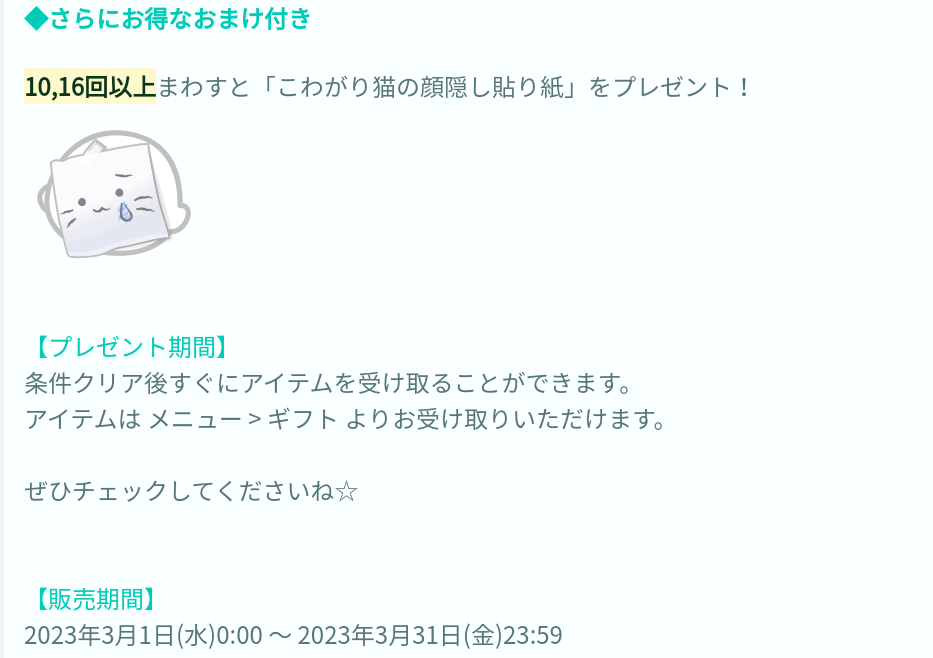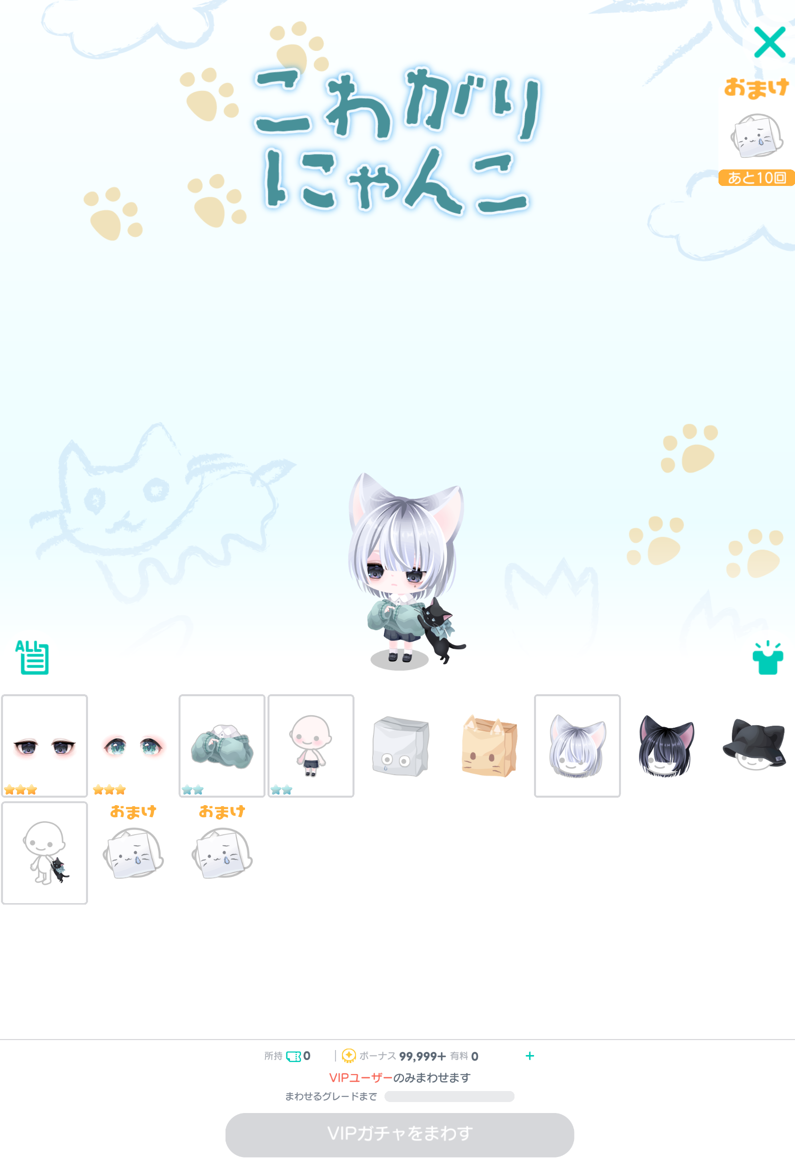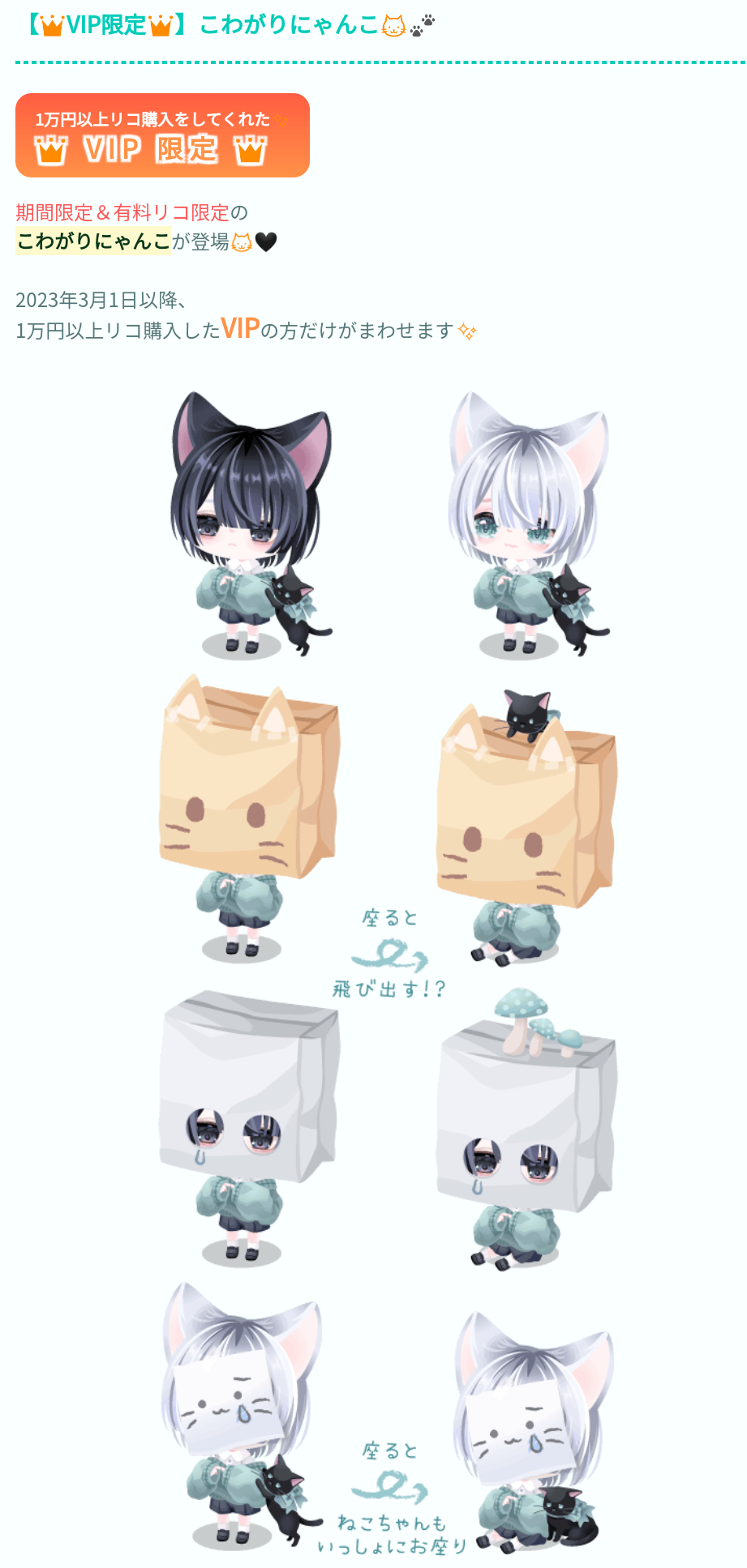 こちらでは2023年3月に登場の毎月1万円課金しているユーザーだけが回せるVIPガチャより「こわがりにゃんこ」が登場したので記録していきますね(^_-)-☆