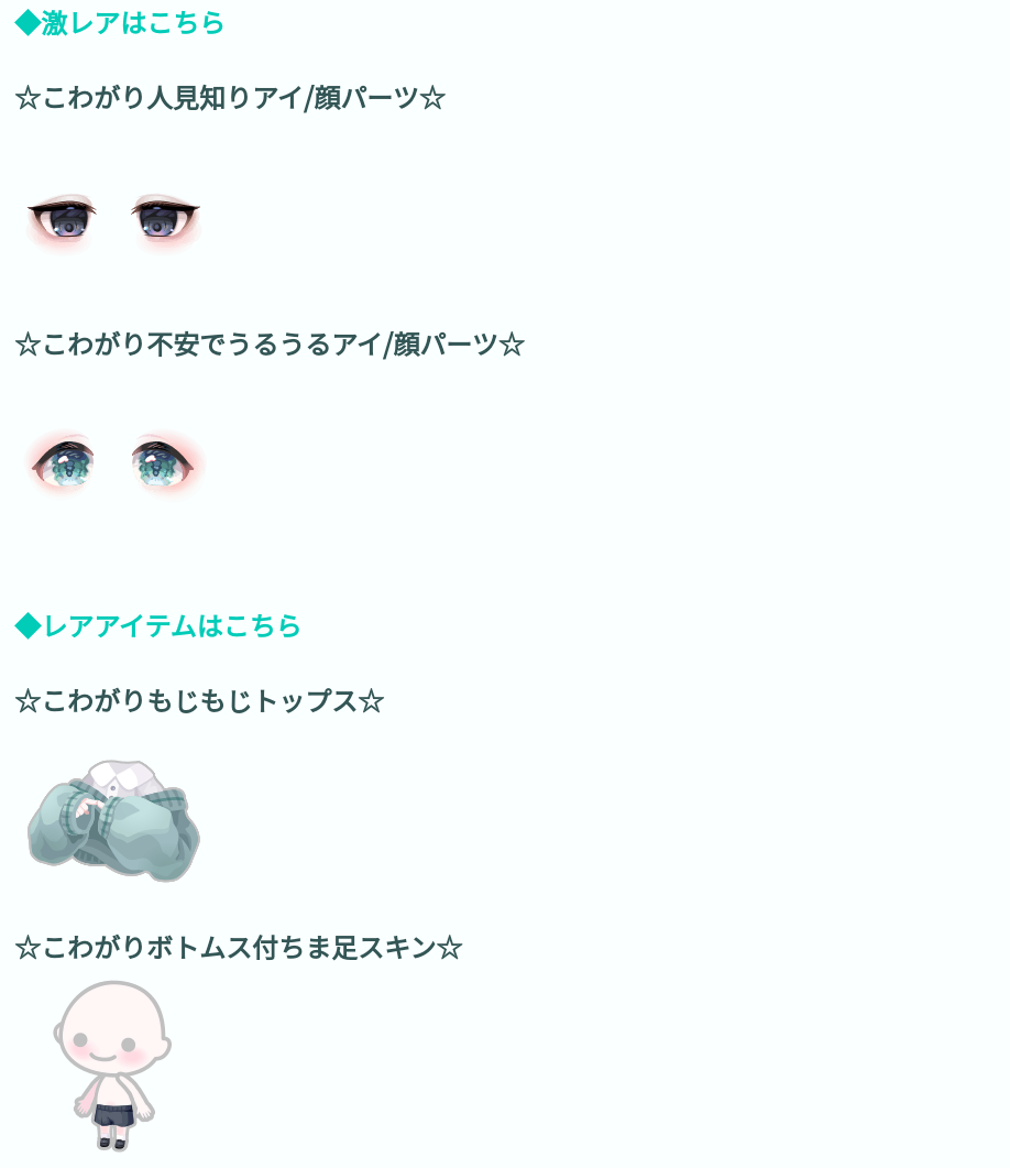 レア設定の方でも仕様は書いていませんが腕が変形しているトップスに最近流行りの他のアバターがついたスキンチェンジアバターとレアリティが上がったり下がったりと正直謎な仕様にテケトー感しか感じないランク付けにしか見えませんね┐(´д`)┌ヤレヤレ