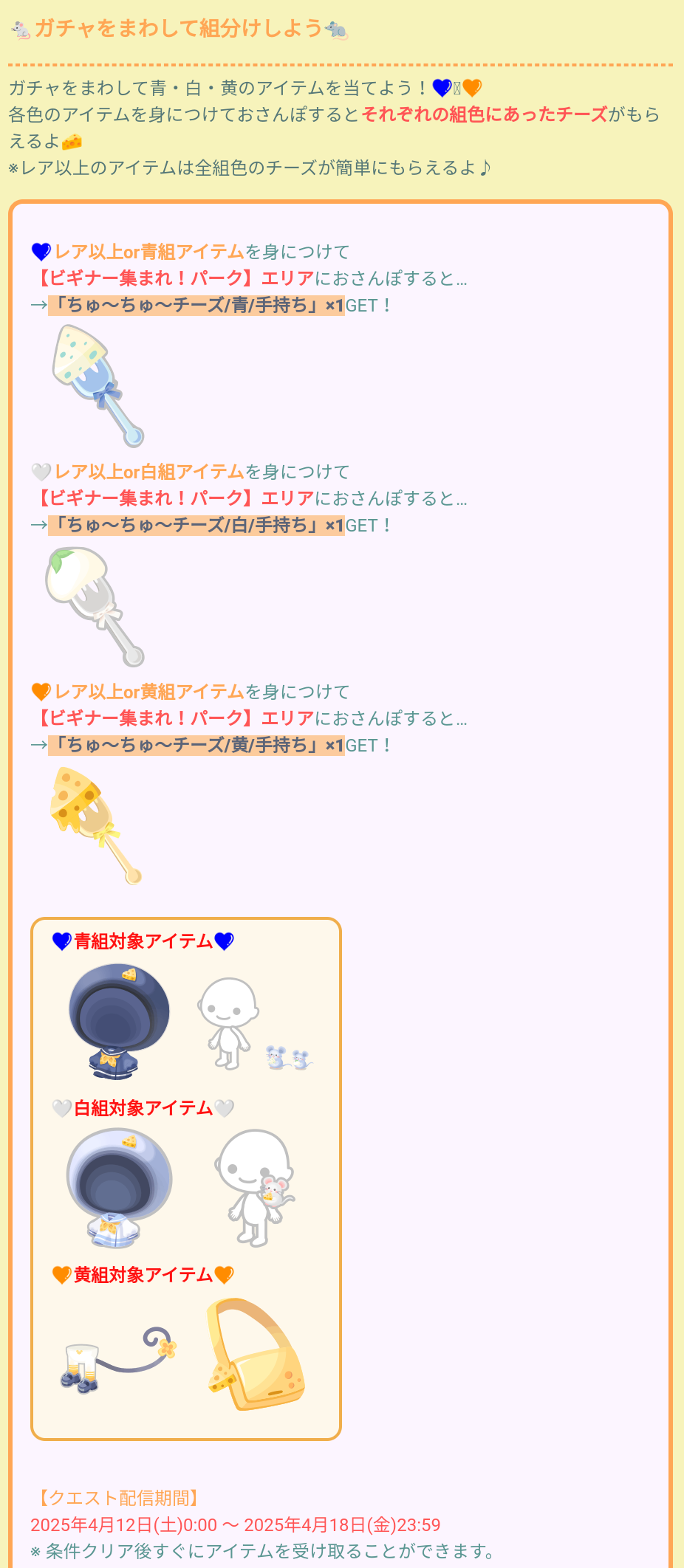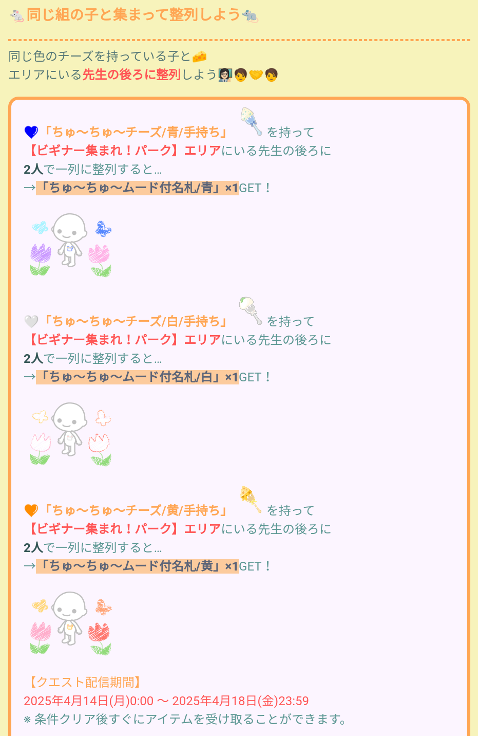 こちらでは2/14からのクエストなっていて、上記での各チーズ手持ち別で2人で先生の後ろに一列に整列すると