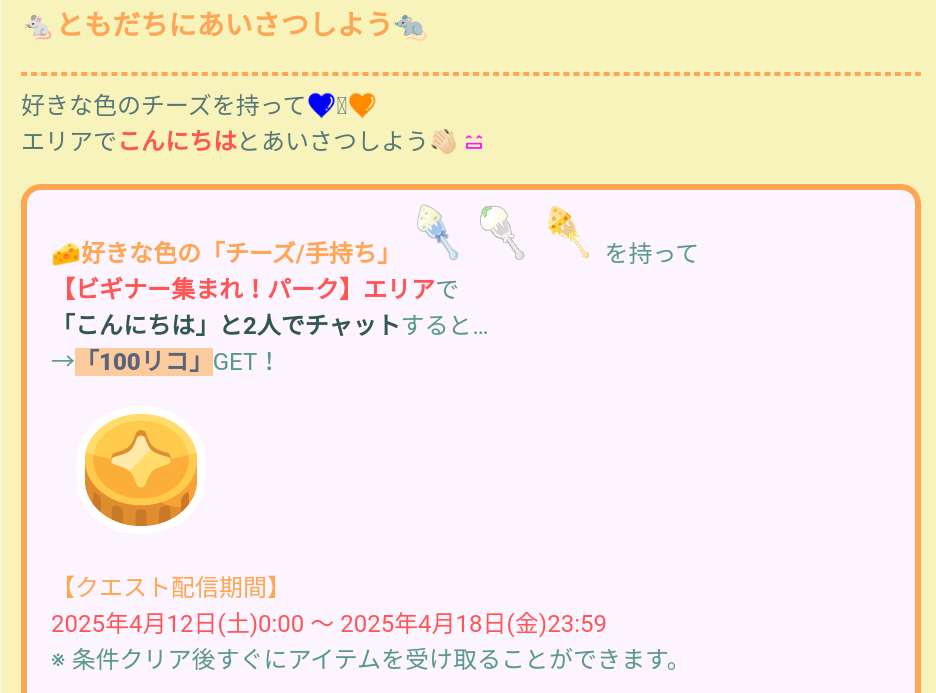 とチーズ/手持ち(各組み分けされた色)のアバター貰えるのでそれをみにつけて2人で『こんにちは』とチャット