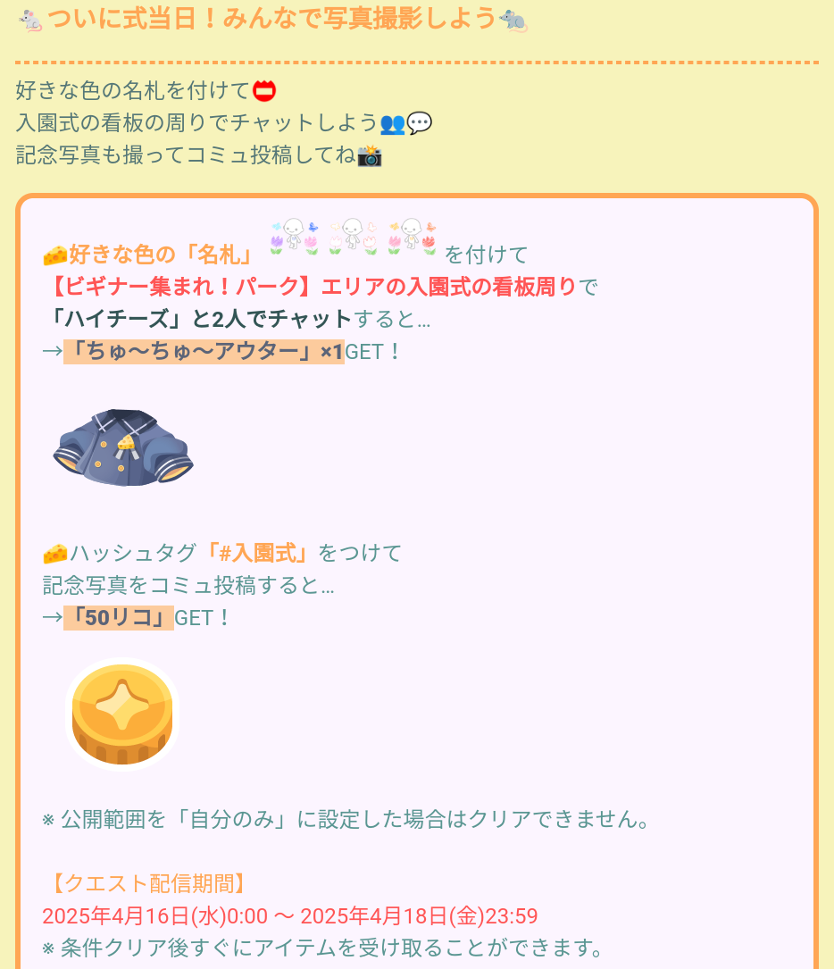 そしてコミュ投稿にてハッシュタグ【#入園式】をつけて全公開にて投稿すると50リコが貰えるのでついでにクリアしておきましょう\(゜ロ\)(/ロ゜)/