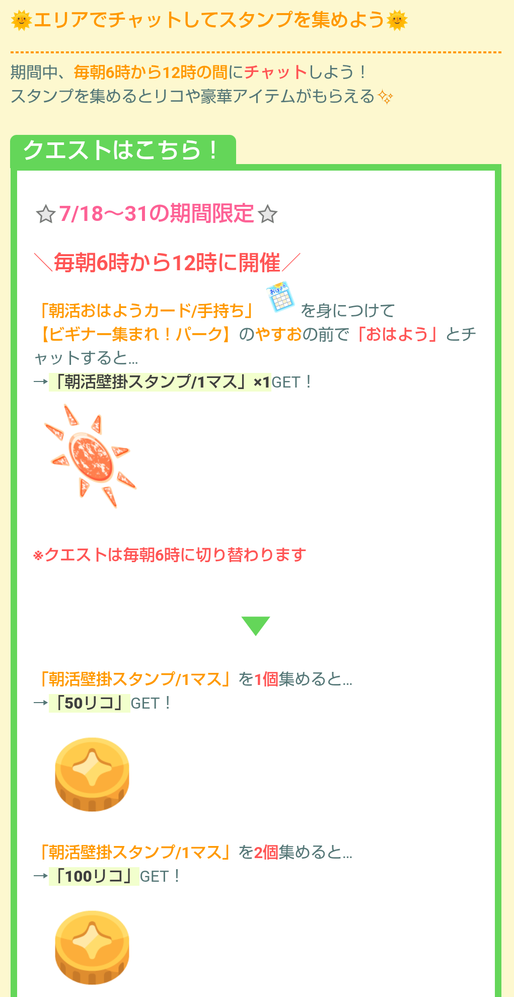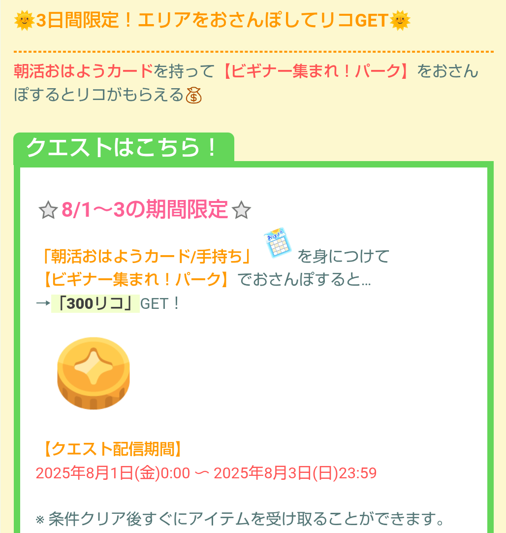 ビギナー集まれ!パークでおさんぽ(適当に移動)することで300リコGETできます。