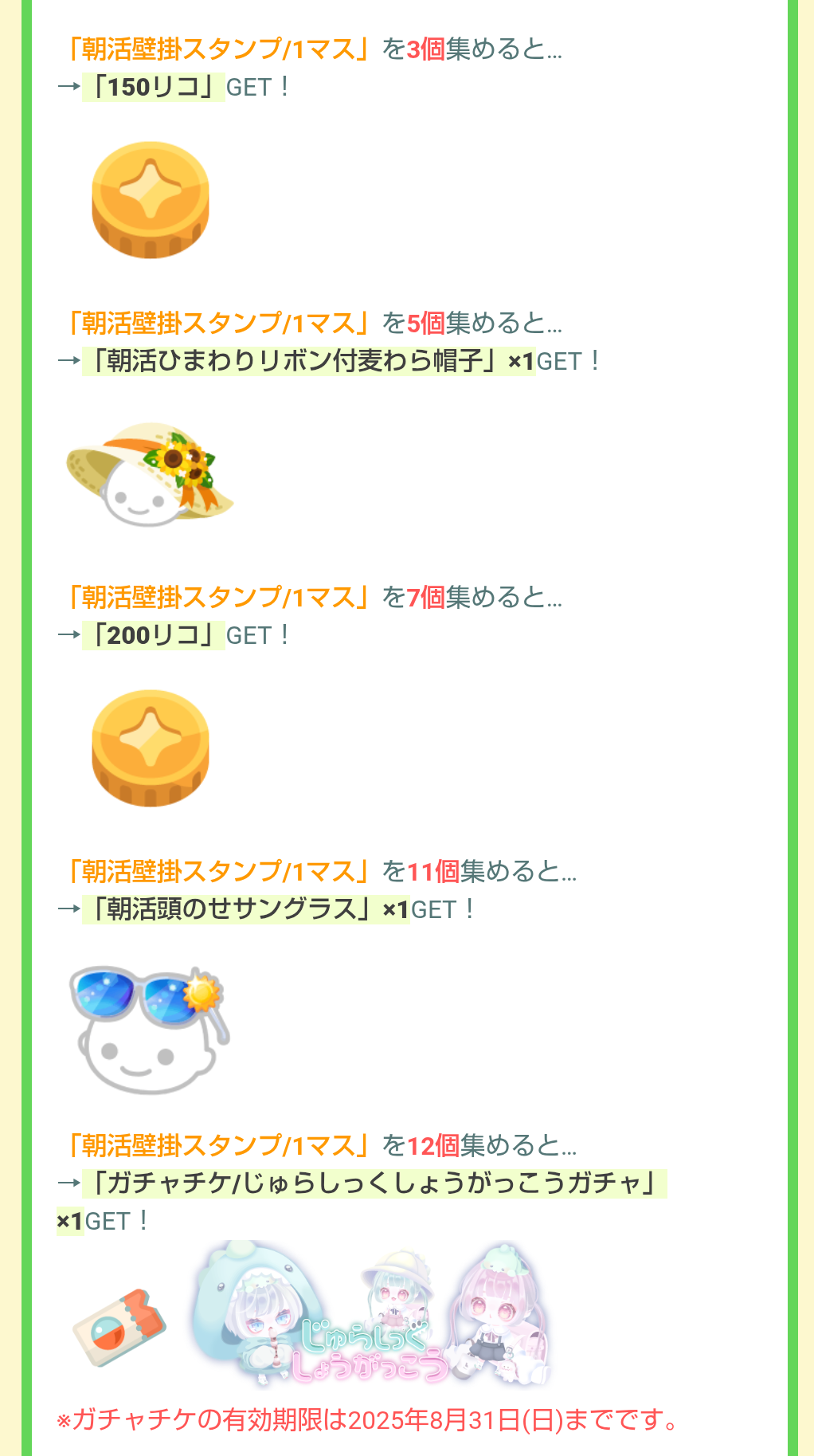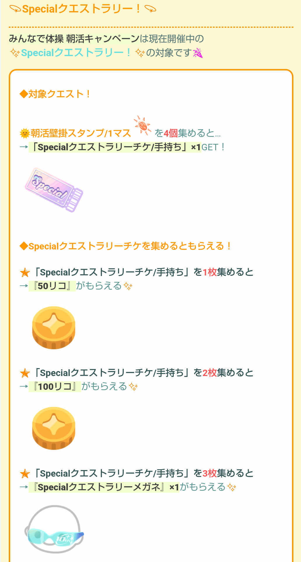 テケトーダデェ 今回の朝活キャンペーンでは壁掛スタンプ4個でこのクエストラリーチケがもらえるから有料ガチャチケをもらうまでの工程で自動的にこのラリーチケ回収になるよね( ゚д゚)タシカニ