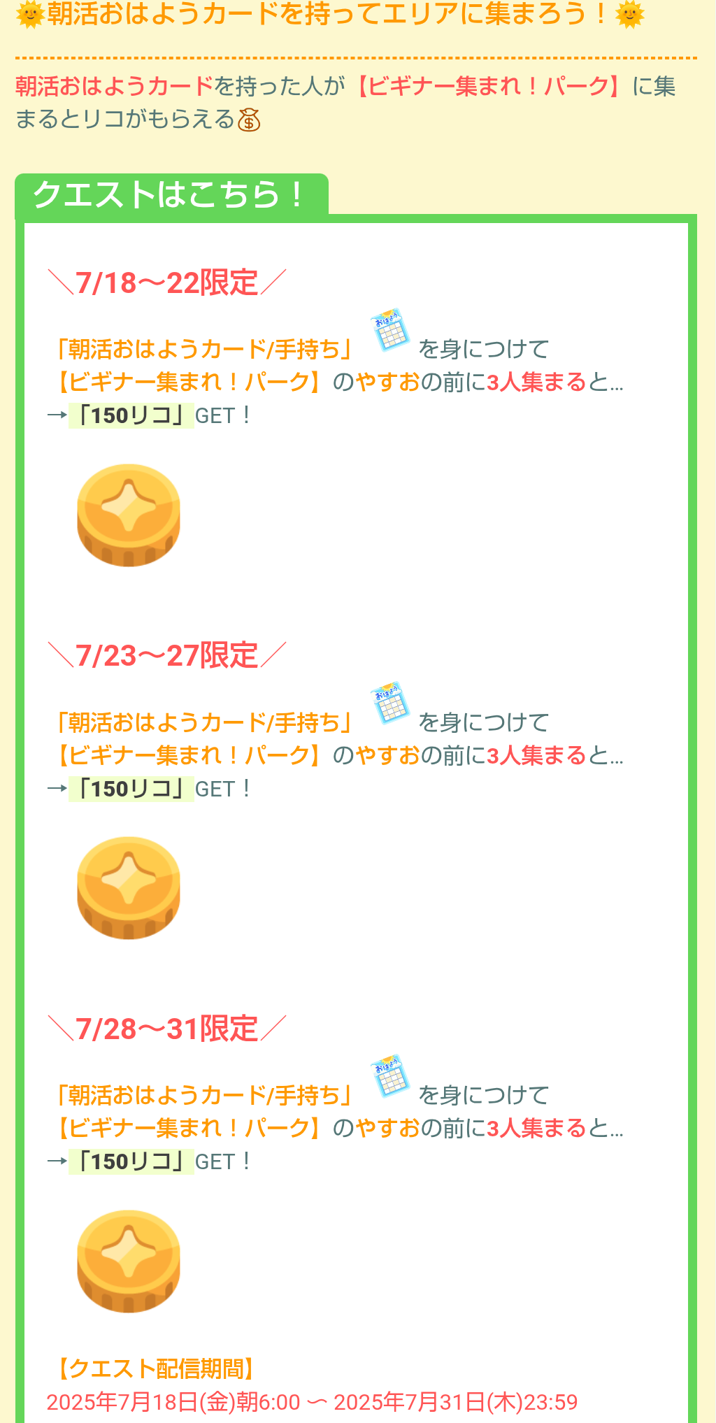 テケトーダデェ 約3日間のスパンで150リコずつもらえて合計で450リコになるのは割とおっきいですねw そしてメインクエストと併せてやるとすぐに追われるとは思うけどやすおにおはようを言うのが個別なのでちょっとめんどくさいかもしれませんね( ゚д゚)タシカニ