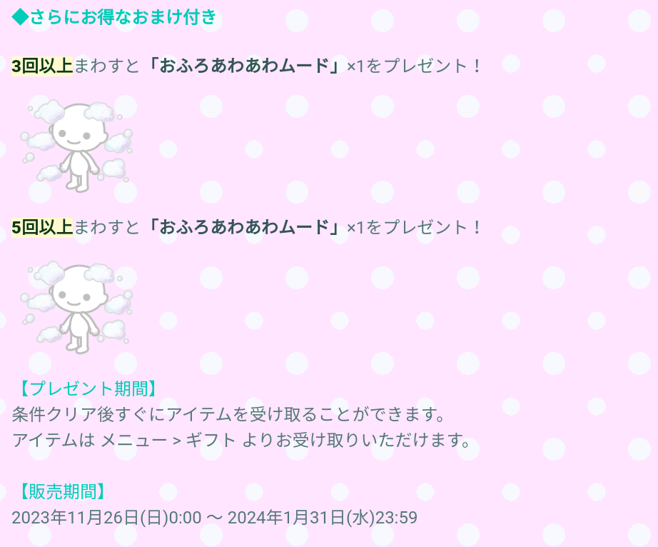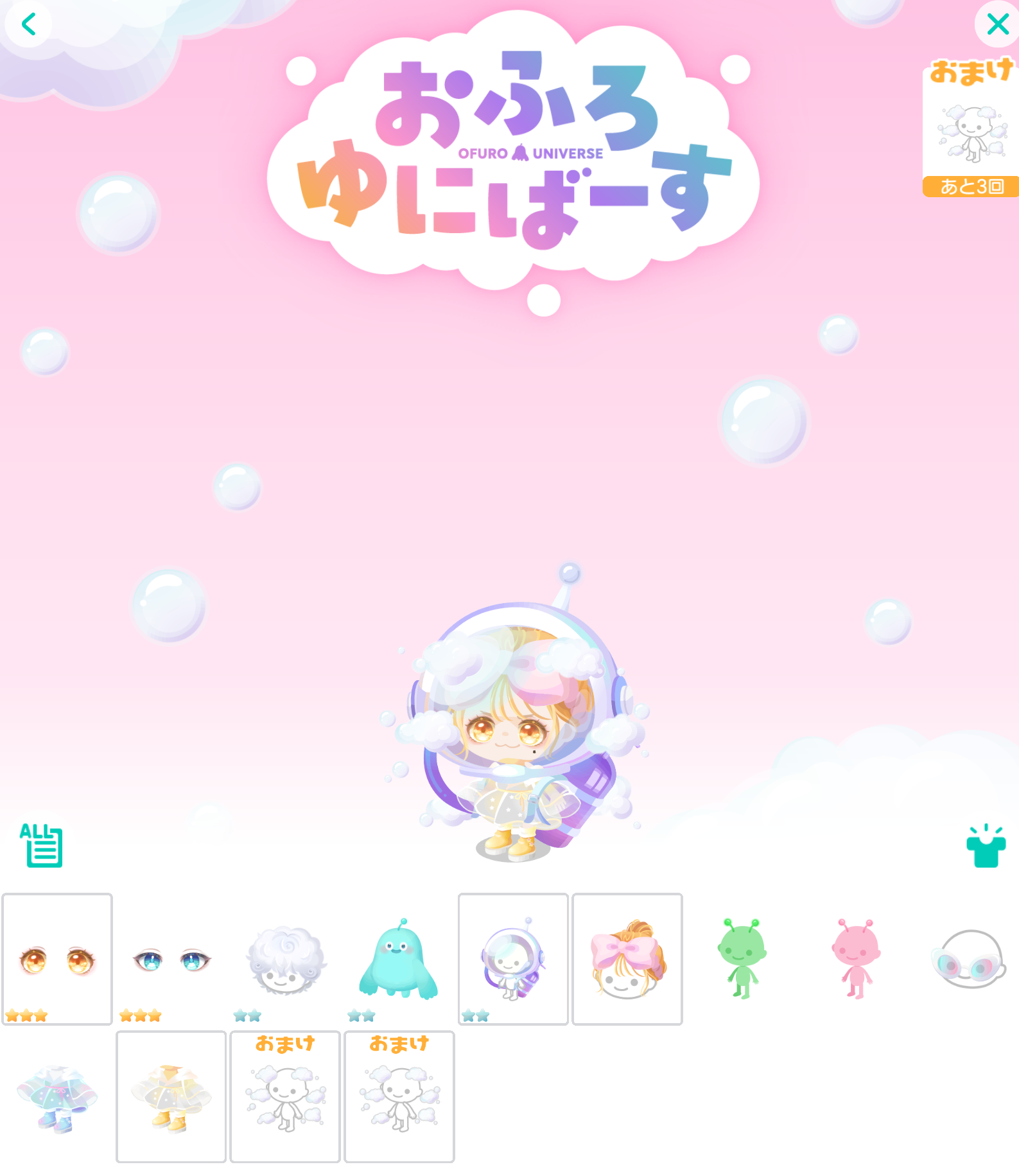 おふろお風呂セット手持ちからおふろゆにばーすガチャを回したら〜それを装着しお風呂に入る事で同時に入った人数によって各アバターが貰えます( ..)φメモメモ