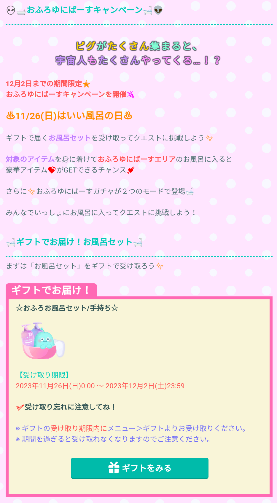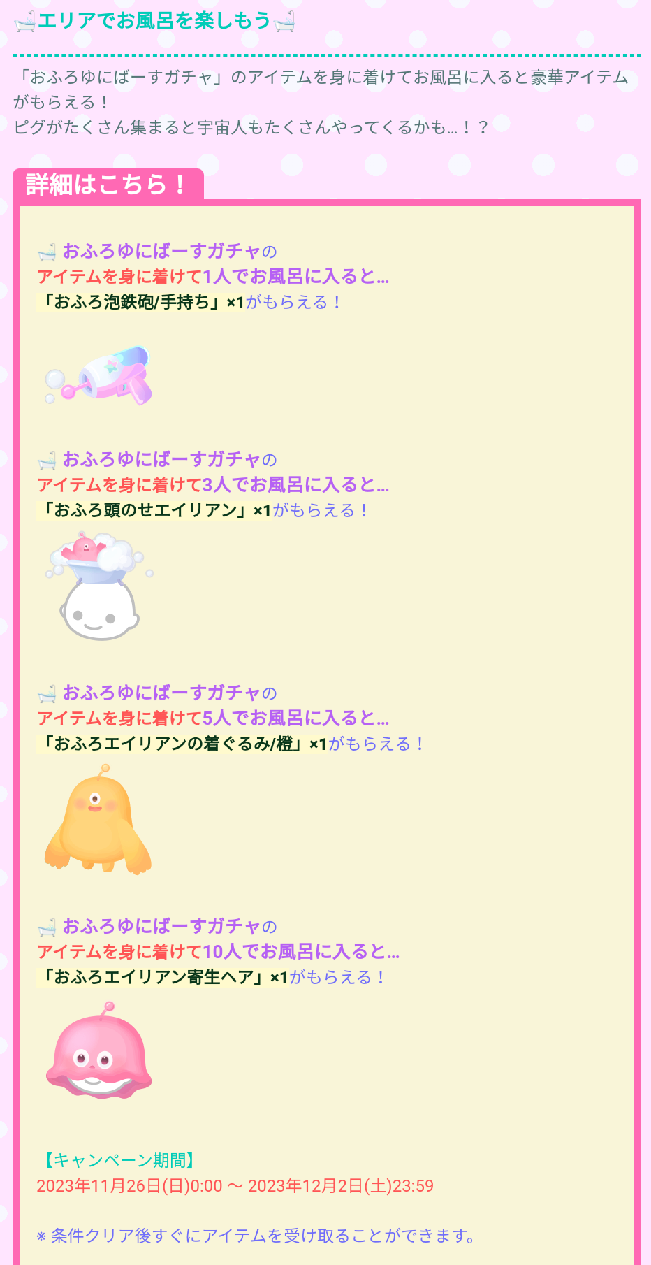 こちらでは11月26日が【良い風呂の日】という事で限定エリア+イベクエにガチャ連動の内容より「おふろゆにばーす」が登場したので記録していきますね(^_-)-☆