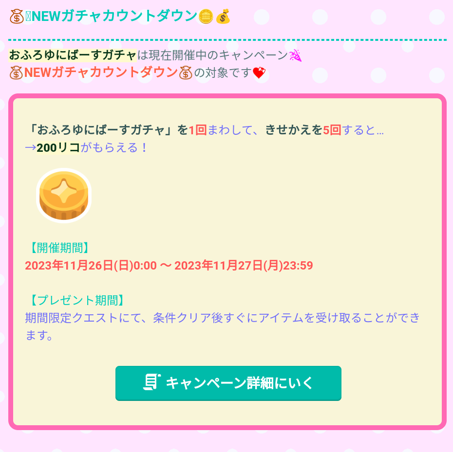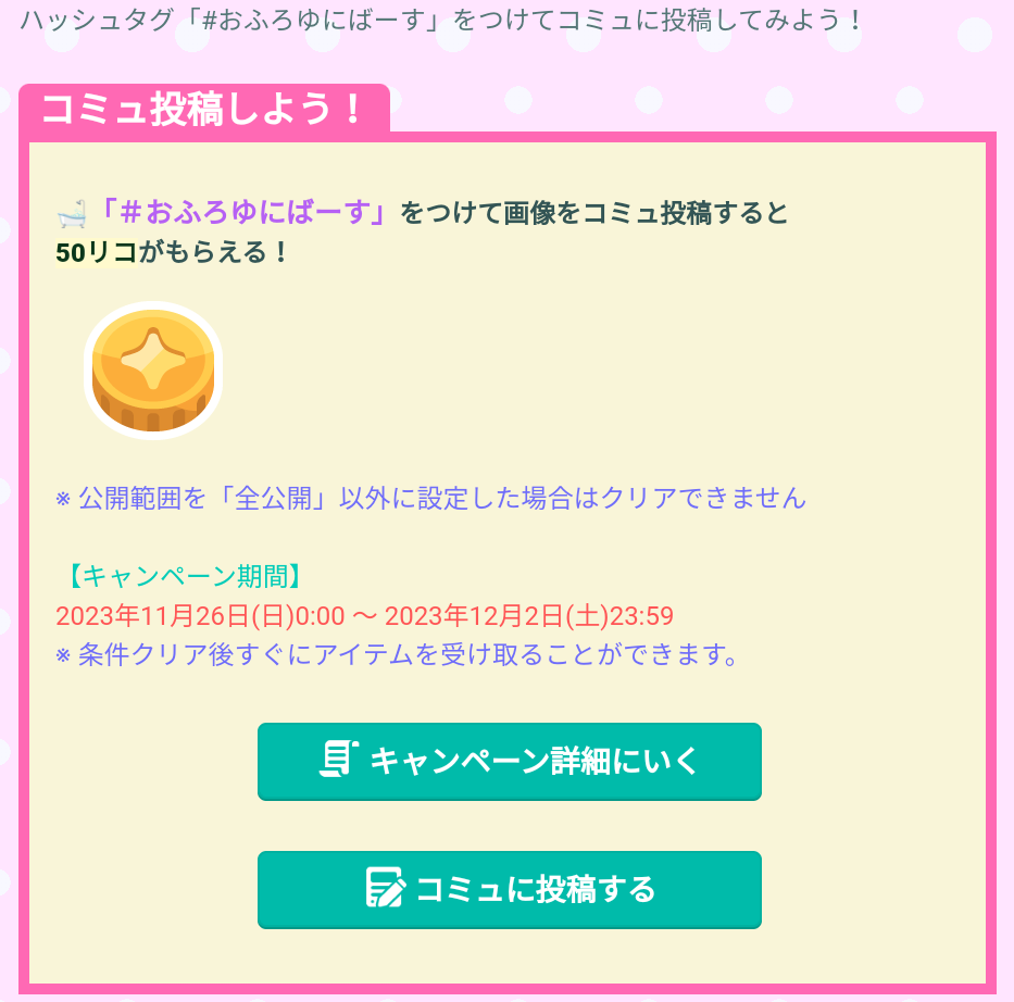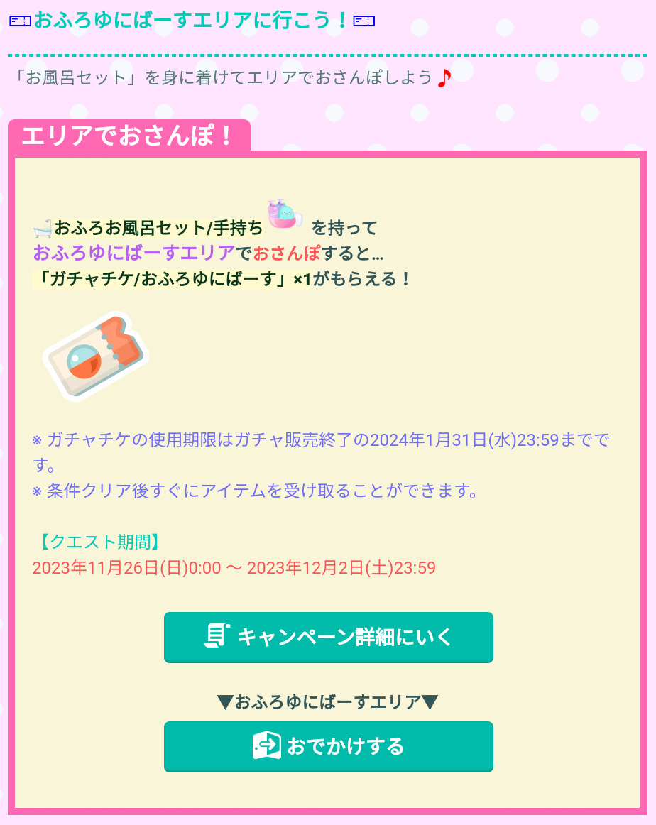 上記からの連動で~おふろお風呂セット手持ちを装着し専用の【おふろゆにばーすエリア】に移動すると後半内容の有料無料選択ガチャのおふろゆにばーすガチャチケが貰えるのでこれで無料リコすら使わずクエストクリアへと進む事が出来るので必ずぶん回しておきましょう(`・ω・´)シャキーン