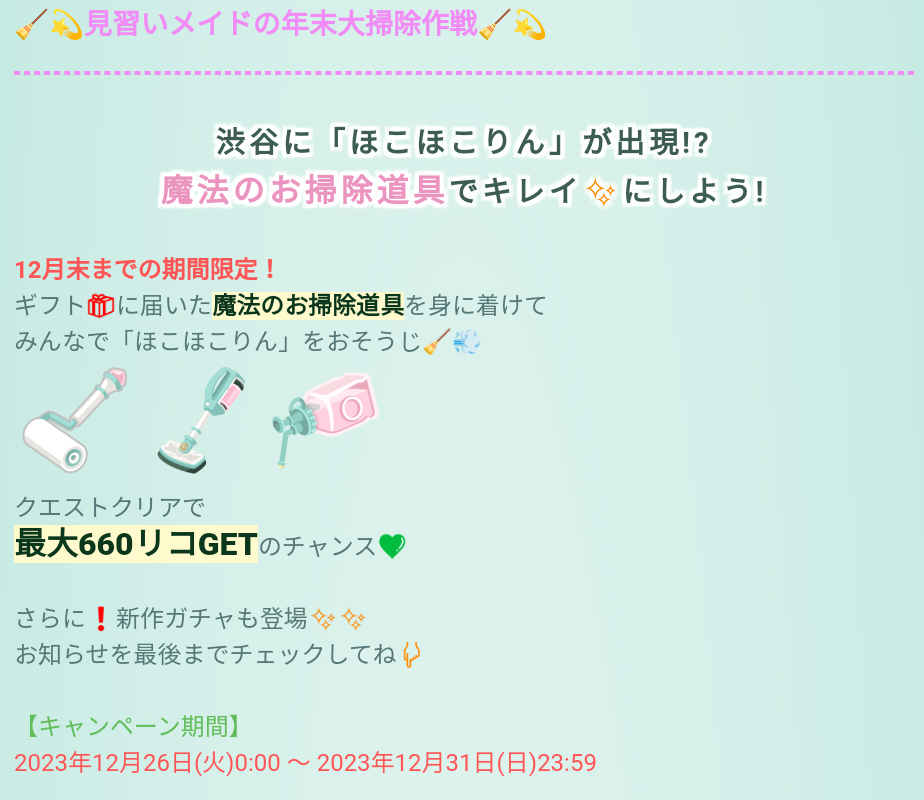 こちらでは2023年の最後(?)の年末の大掃除クエスト&有料無料選択ガチャより「見習いメイドの年末大掃除作戦&見習いメイドとお掃除の魔法」が登場したので記録していきますね(^_-)-☆