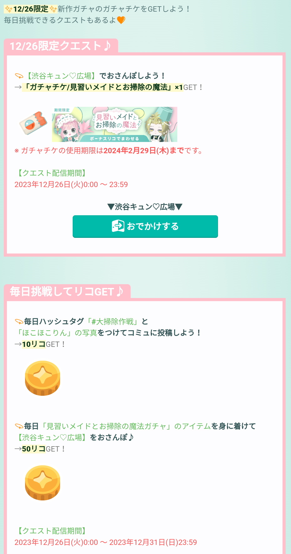 クエスト内容ではまず渋谷エリアに行くことで見習いメイドとお掃除の魔法ガチャのチケットがもらえるので忘れずに向かいましょう(-_-)/~~~ピシー!ピシー!