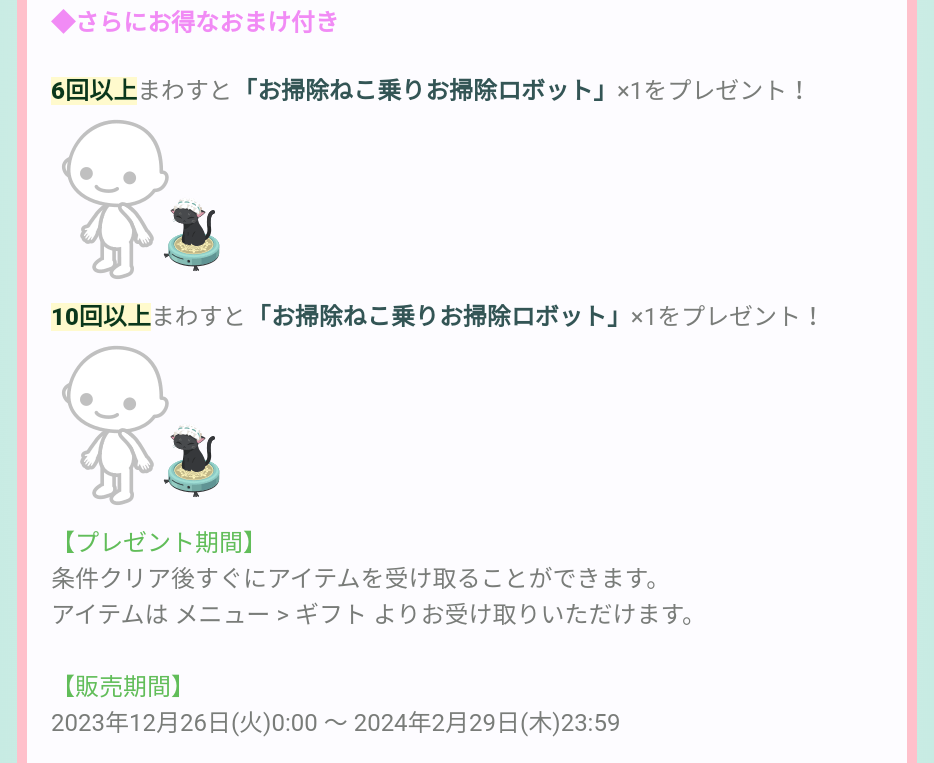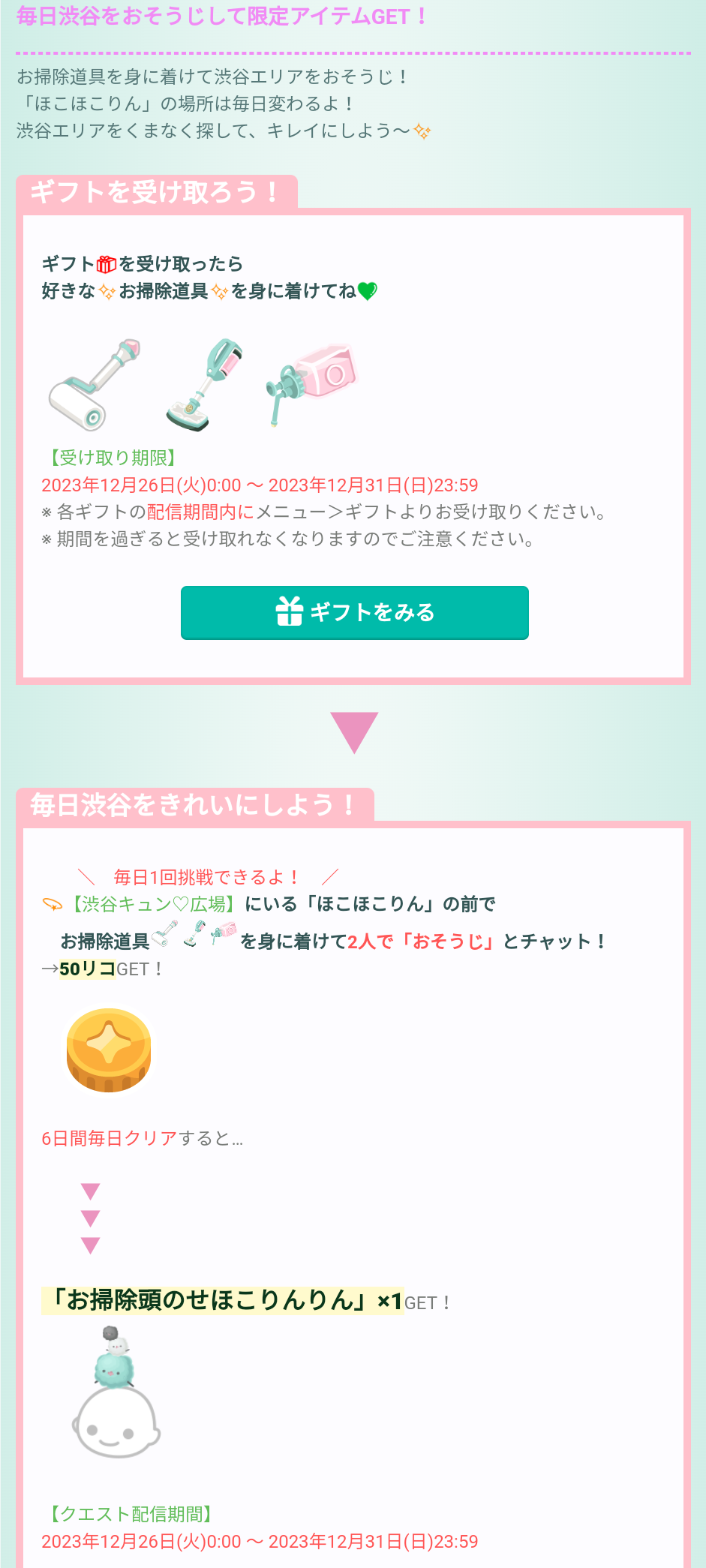 更にほこほこりんの前で上記のログインギフトを装着し2人で『おそうじ』とチャットすることで期間内毎日リコもらえ、6日間毎日クリアすることで頭乗せほこほこりんがもらえるそうです。