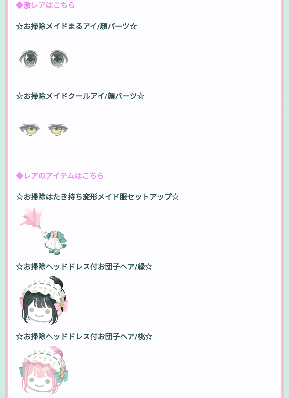 そしてレア設定では腕変形シリーズのはたきを持ったメイド服セットアップと一応モチーフネタには沿っているんだけど~正直メイドファッションって散々しつこいくらいに登場しているのでそこまでレア感を感じないし、ヘッドドレス付きの髪型が2種類もレアにあり「他に選定物がなかったのか?」って思えちゃうくらいのショボさがあるのでいくら有料無料だからっていってもこれはやっぱりイマイチだとしか言いようがないレアリティですね(´ε`;)ウーン…w