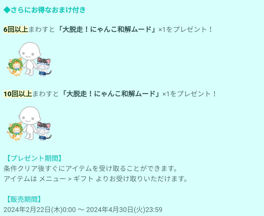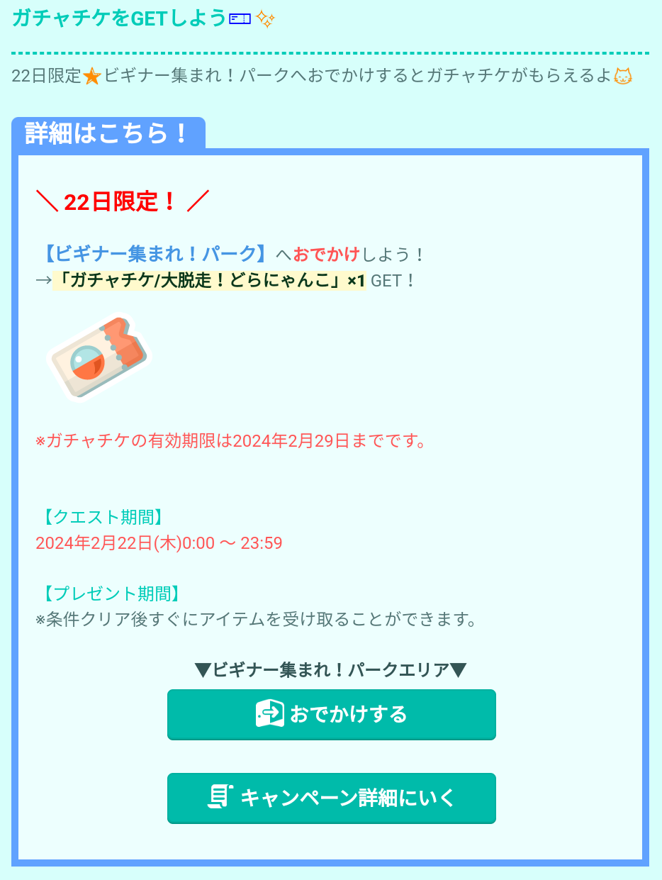 2/22日限定で今回のクエストを行うビギナー集まれ!パークにお出かけすることで有料無料だけど参加権として貰える大脱走!どらにゃんこガチャのガチャチケが貰えるのでクエも含めてお出かけすることをおススメしますね(´ー`*)ウンウン
