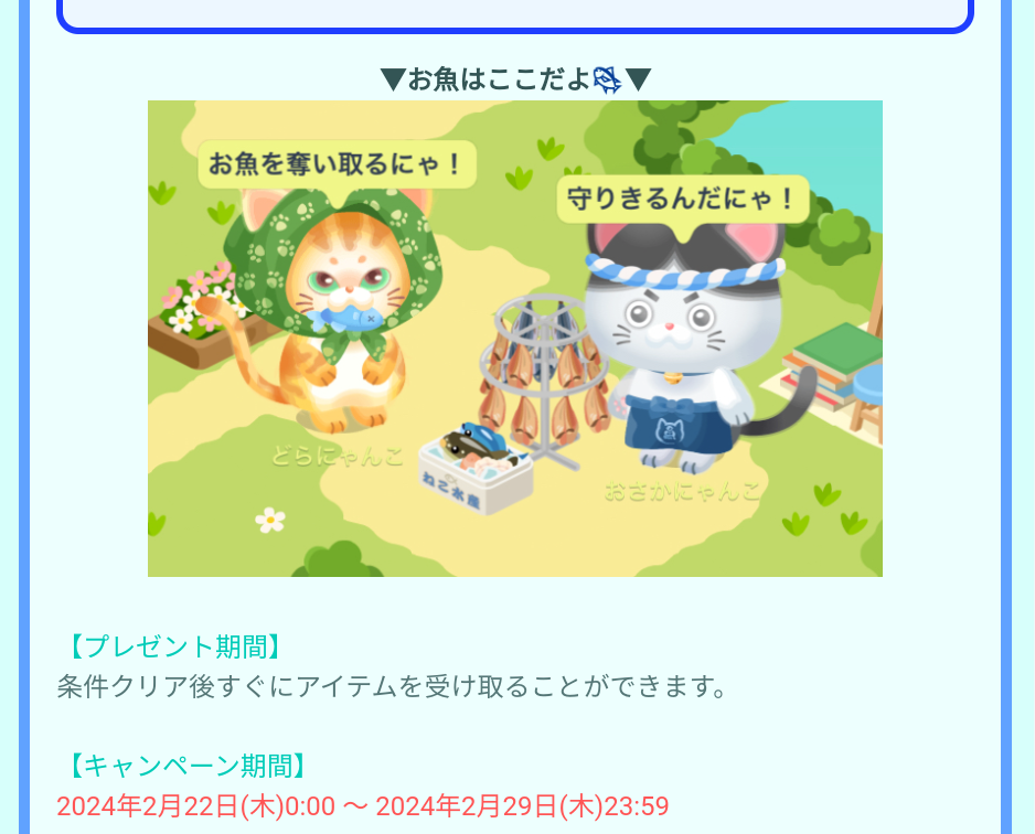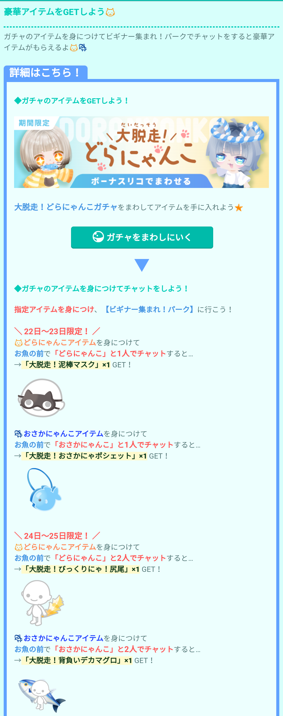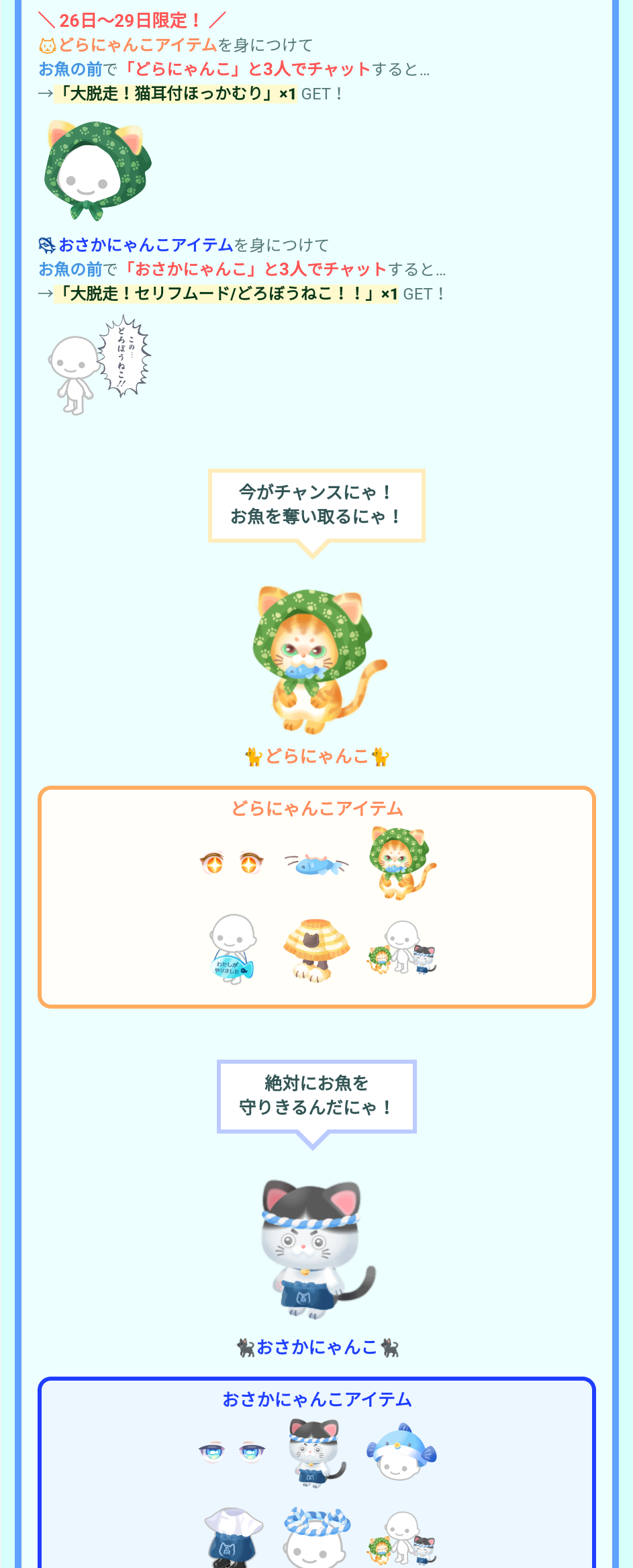 各イベントクエスト日程にてどらにゃんこアイテムとおさかにゃんこアイテムに分かれたアバターを装着しどらにゃんこクエストなら【上記のおさかなが置いてある場所にて『どらにゃんこ』とチャット】、おさかにゃんこクエストなら【上記のおさかなが置いてある場所にて『おさかにゃんこ』とチャット】することでクエストが進みアイテムをゲットすることができます(‘ω’)ノ