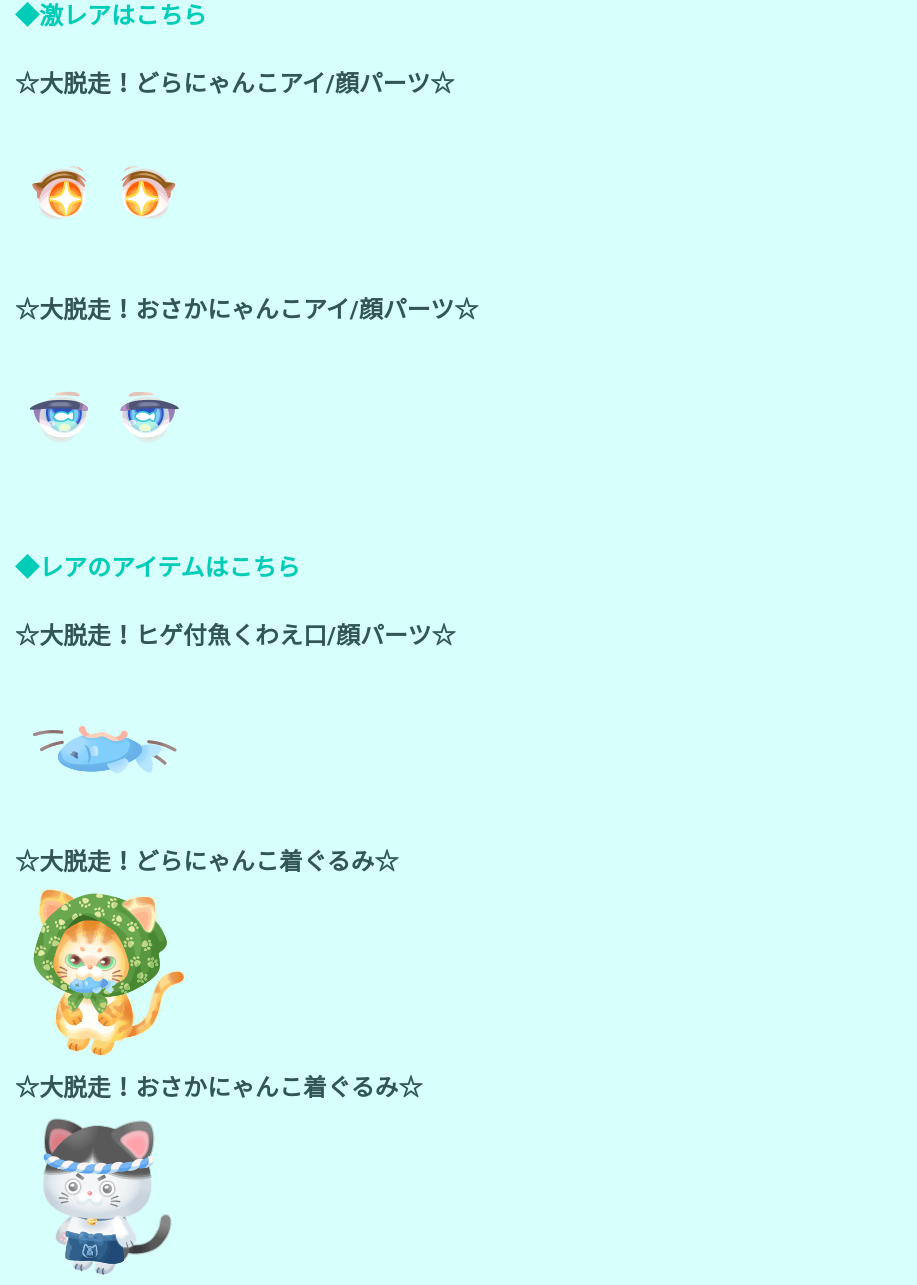 ↓↓↓以下より大脱走!どらにゃんこガチャ内容となります↓↓↓