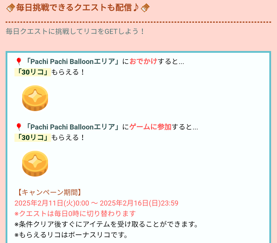 期間内にてイベントクエストが行われているエリアへおでかけ、そしてゲームに参加することで30リコずつ貰えるので