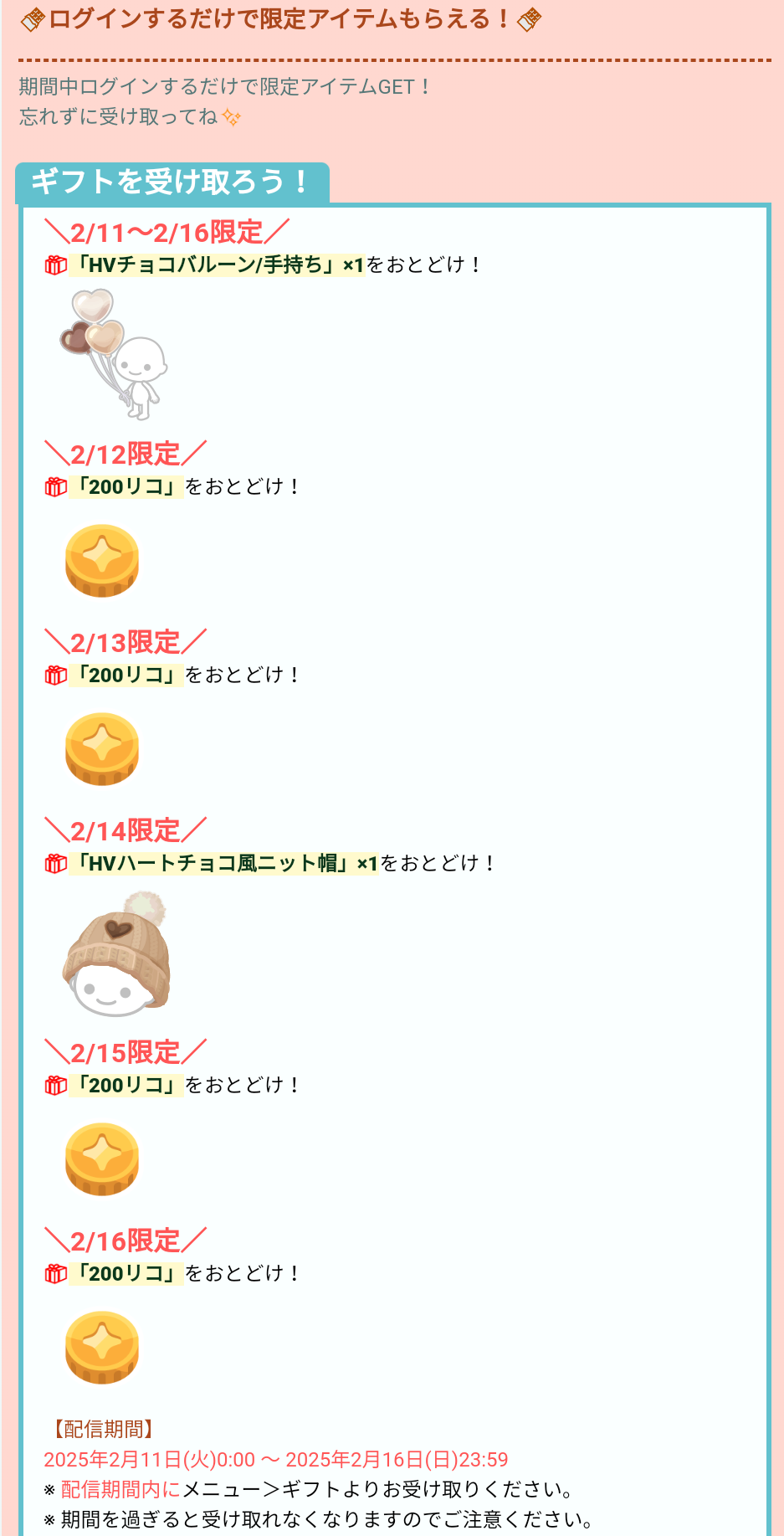 こちらでは毎日ログインするたびに限定アバターや無料リコが貰えるログインギフトが行われています。