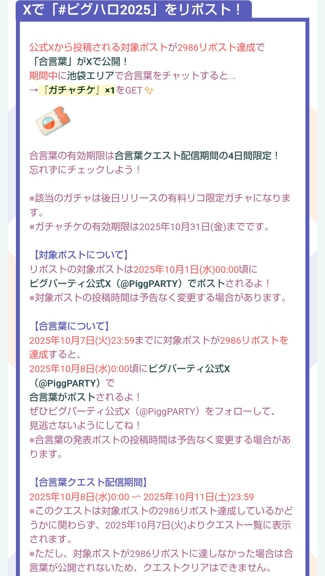 各日程別でピグハロMIXガチャチケGET