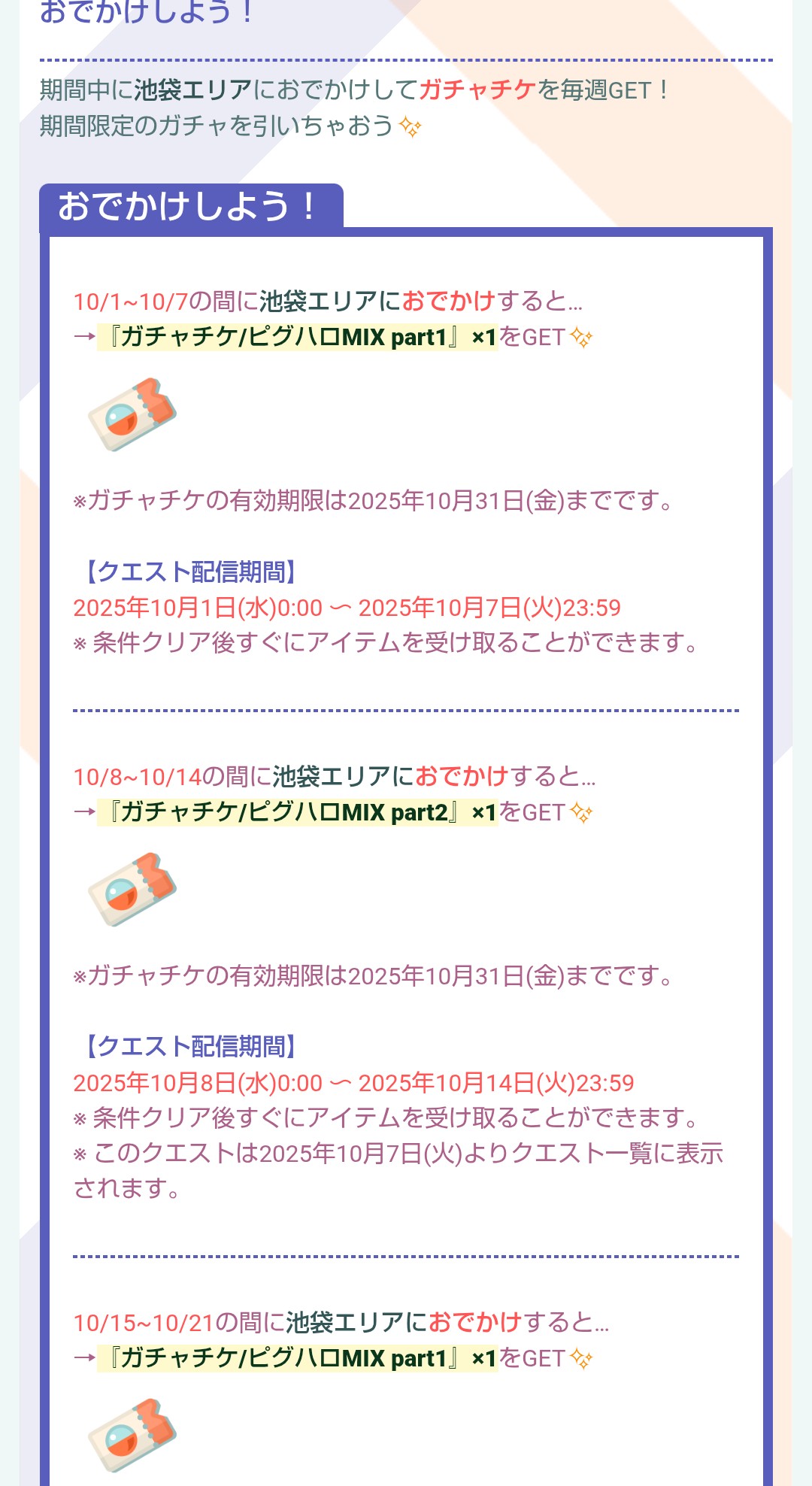 池袋エリアへおでかけ→ピグハロMIX part2のガチャチケ×1ずつ計2枚