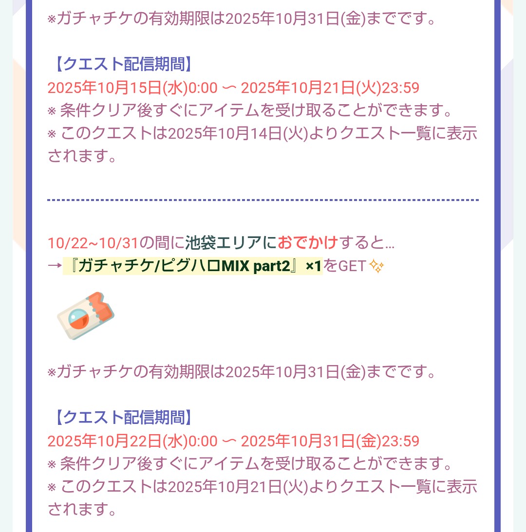 こちらでは10/1〜31日までの間で毎日行えるクエストとガチャチケがもらえるクエストの内容を記載しています。
