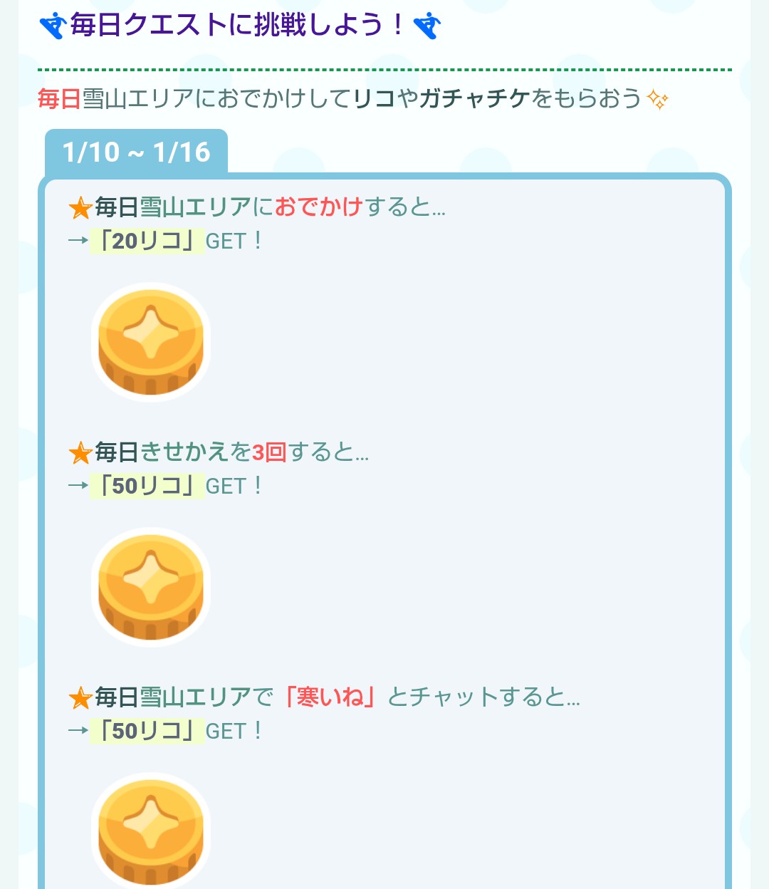 こちらでは期間中毎日行えるクエスト内容を記載しています。
