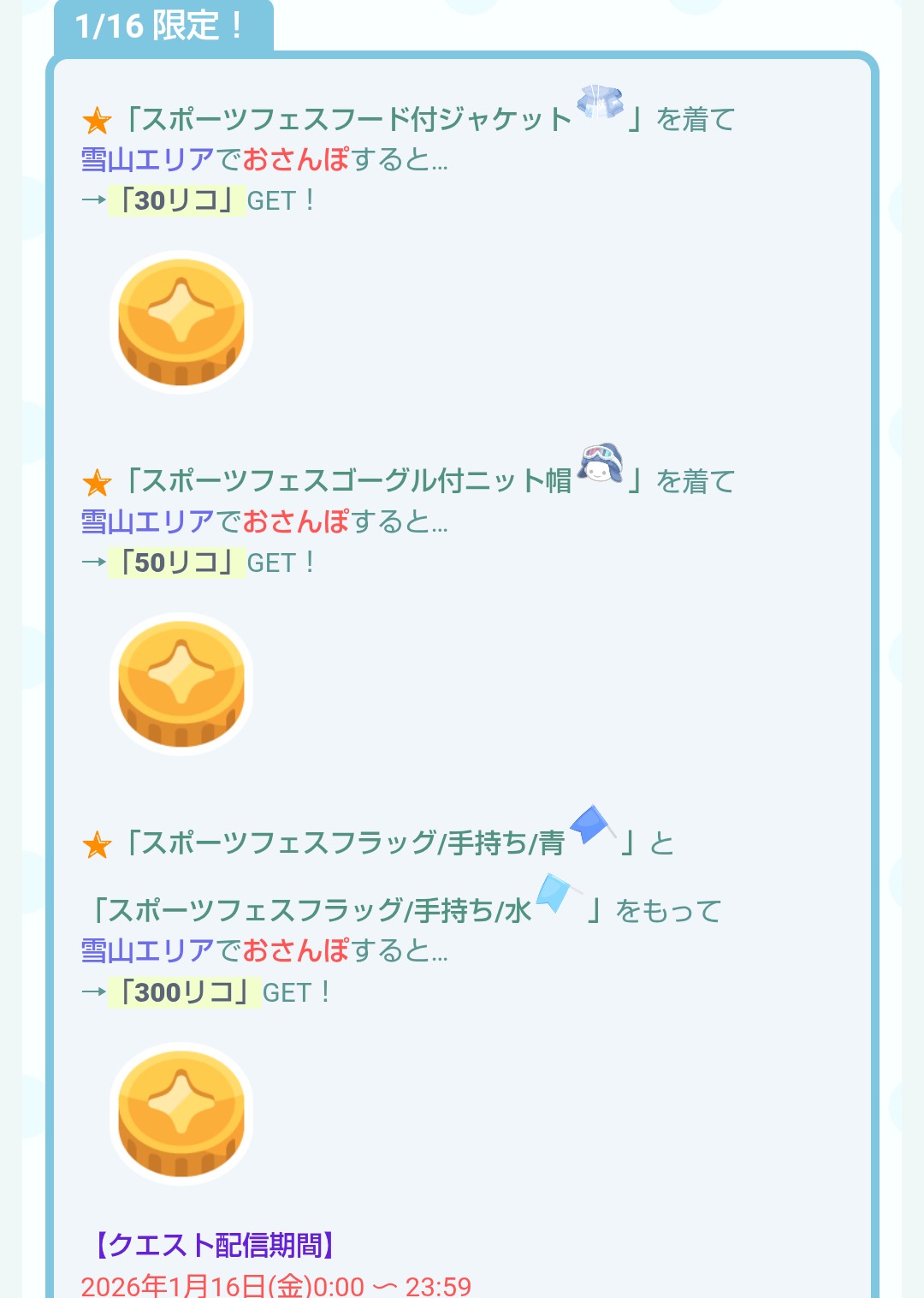 こちらでは10〜16日での各日程別でのクエスト内容を記載しています。