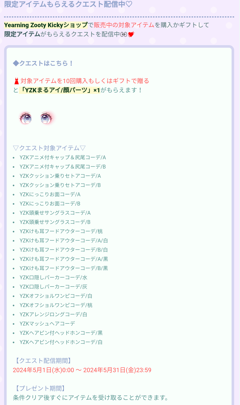 いつもであれば個別に登場していてクエストとも関係ない感じなんだけど何故か今回ばかりは同日登場のアニマルロックフェス2024ガチャとクエストとの連動に合わせてこちらのヤーニングズーティキッキーショップアバターもクエスト対象になっているのでアイテム上限が来ている課金者ユーザーの方々も有料内容なら空けれるわwって感じでクエストに参加可能になっているっていうのは(・∀・)イイ!!ことなのかもしれませんね(ΦωΦ)シランケドw