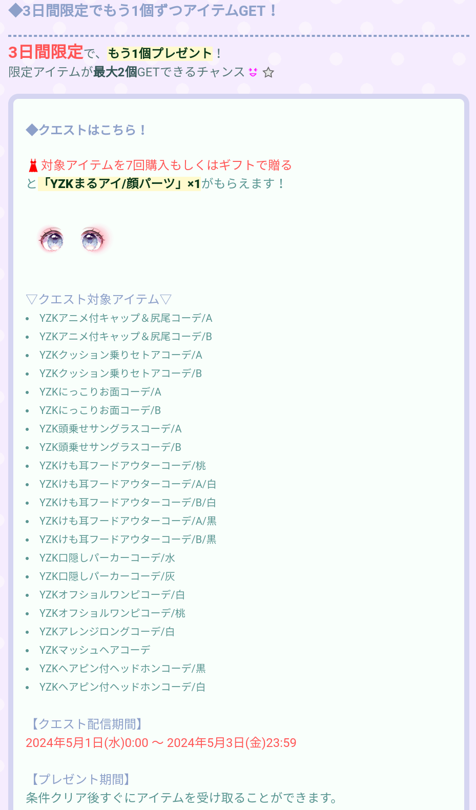 そして販売開始から3日間限定クエストとして7着分の購入orギフトで3回ほど少ない回数で目が貰えるそうなんだけど~結局こちらも7着分という結構な数を課金しないといけないので相変わらずの鬼畜仕様過ぎて誰得なんだろうか?って思っちゃいますね( ゚д゚)ソレナ