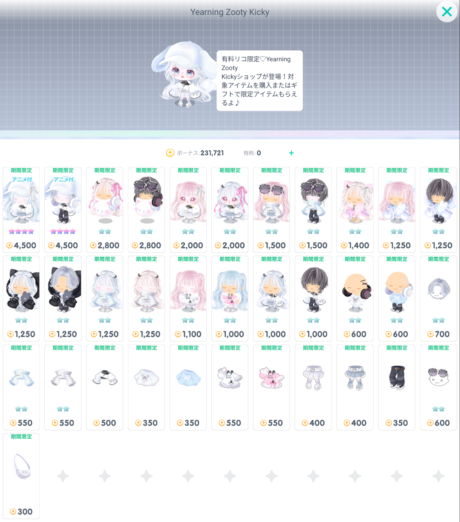 内容はアニメーション付きコーデが一番高くて4500リコとなってはいるけどオシャレで個性もあるので☆4アバターを直に購入できる分としてはだいぶん安くはなったと思いました(;^_^A