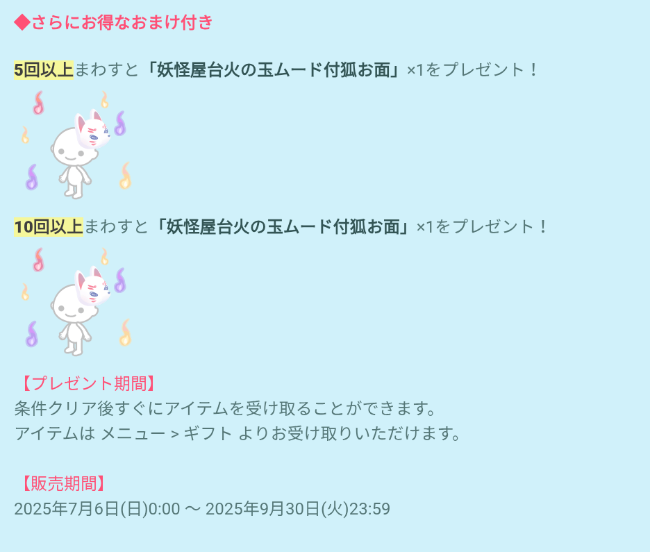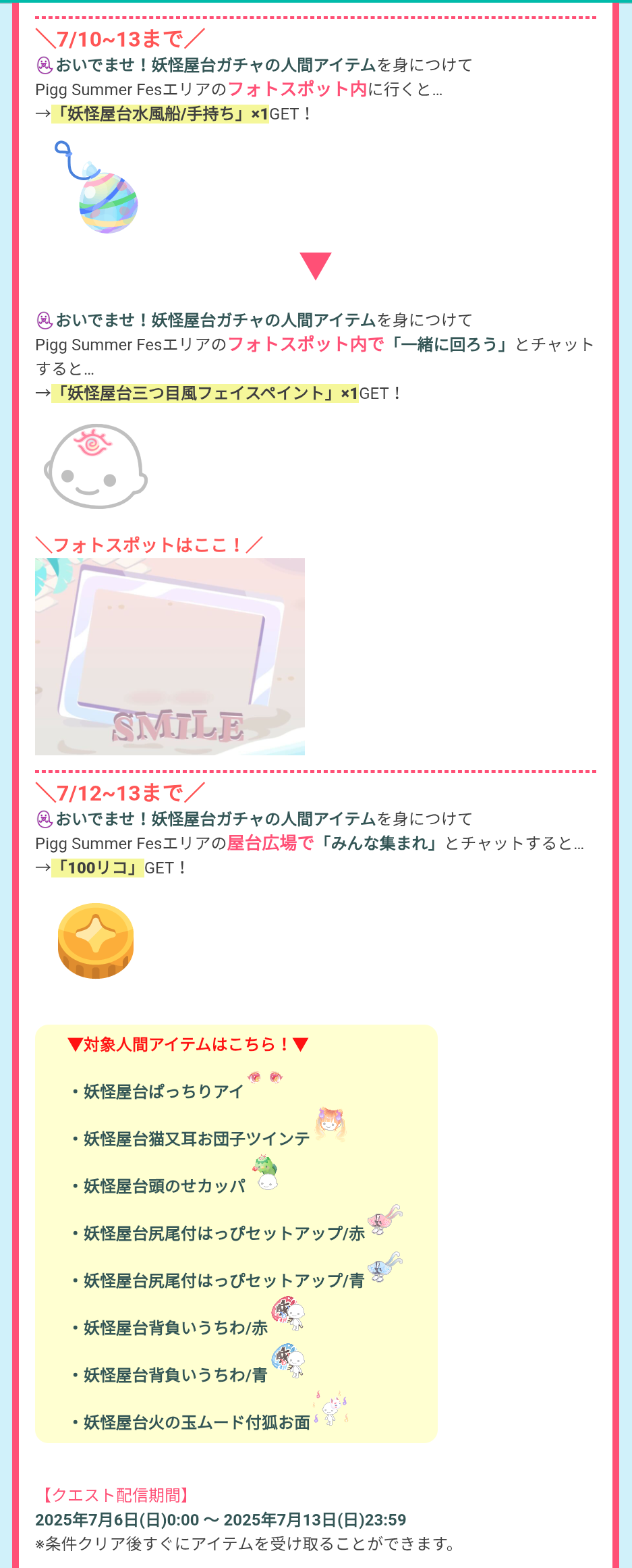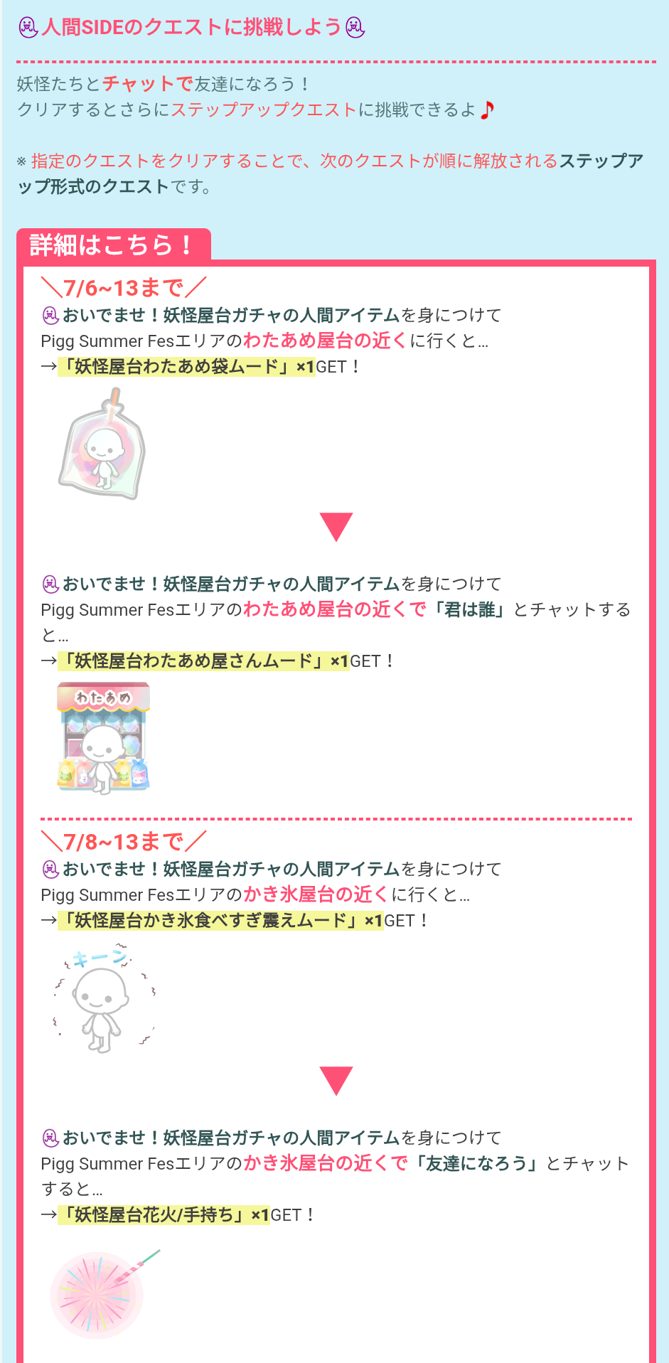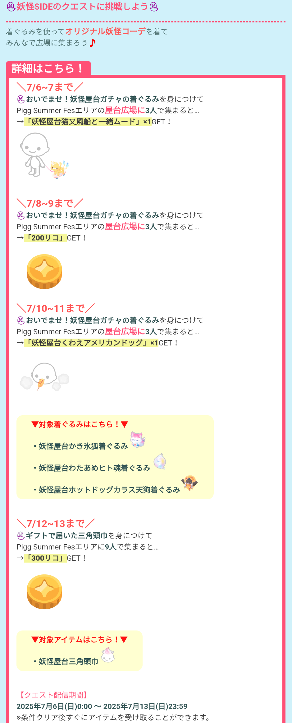 こちらでは各日程別で下記内容のおいでませ!妖怪屋台ガチャのアバターを装着した前提のクエスト内容を載せています。