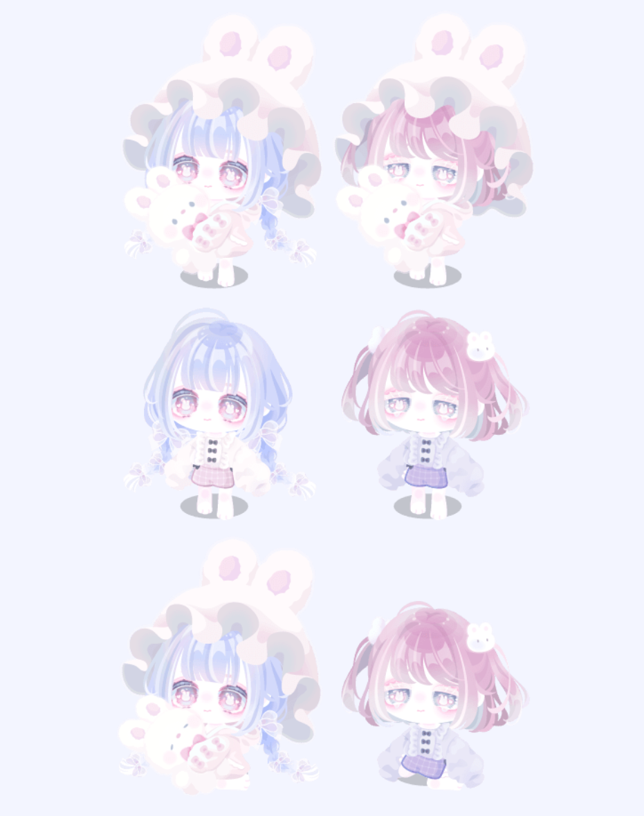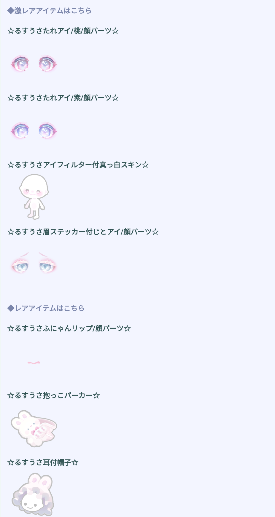 全体的なラインナップ一覧ではボリューム感は13個と少なくおまけや服アバターなどがただの色違いや2個目っていうことなのでよりよく品数が少なくボリューム量が薄い内容なガチャなんだなぁって思う印象でした(;^ω^)