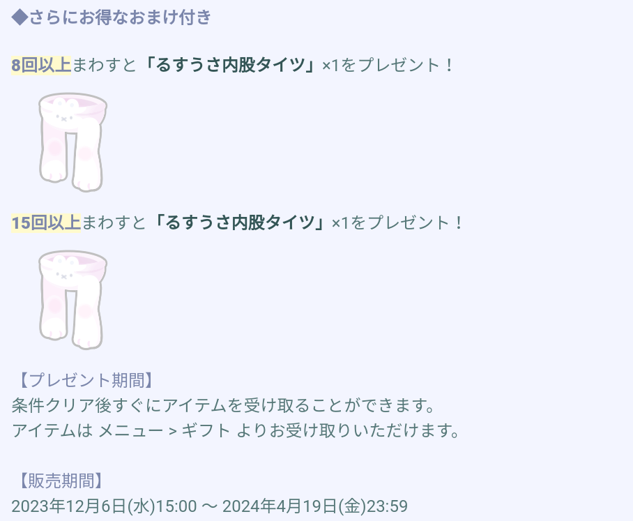 おまけ内容では相変わらずの搾取スタイルで初回の連ガチャでは貰えない8回+毎度お馴染みこうかん機能用に2個目が貰える15回という回数設定にやはりやっぱり(大事な事なので2回言いましたw)人気動物ネタだから強気に来ている内容なのでいくらタイツと言えどサービスより搾取重視なんだろうなぁって思うと課金していくユーザーの不満度はドンドン上がりそうに思う内容ですね(ΦωΦ)シランケドw