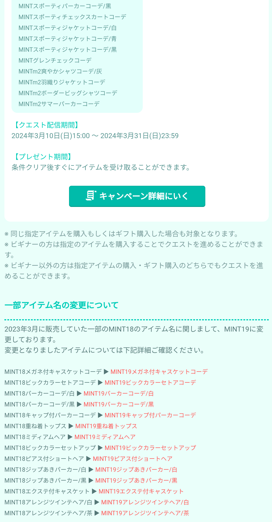 名前が変わるアイテムはどうやら2023年3月に登場のMINT18のアイテム名がMINT19用となっただけっていう状況らしいです( ´_ゝ`)フーンw