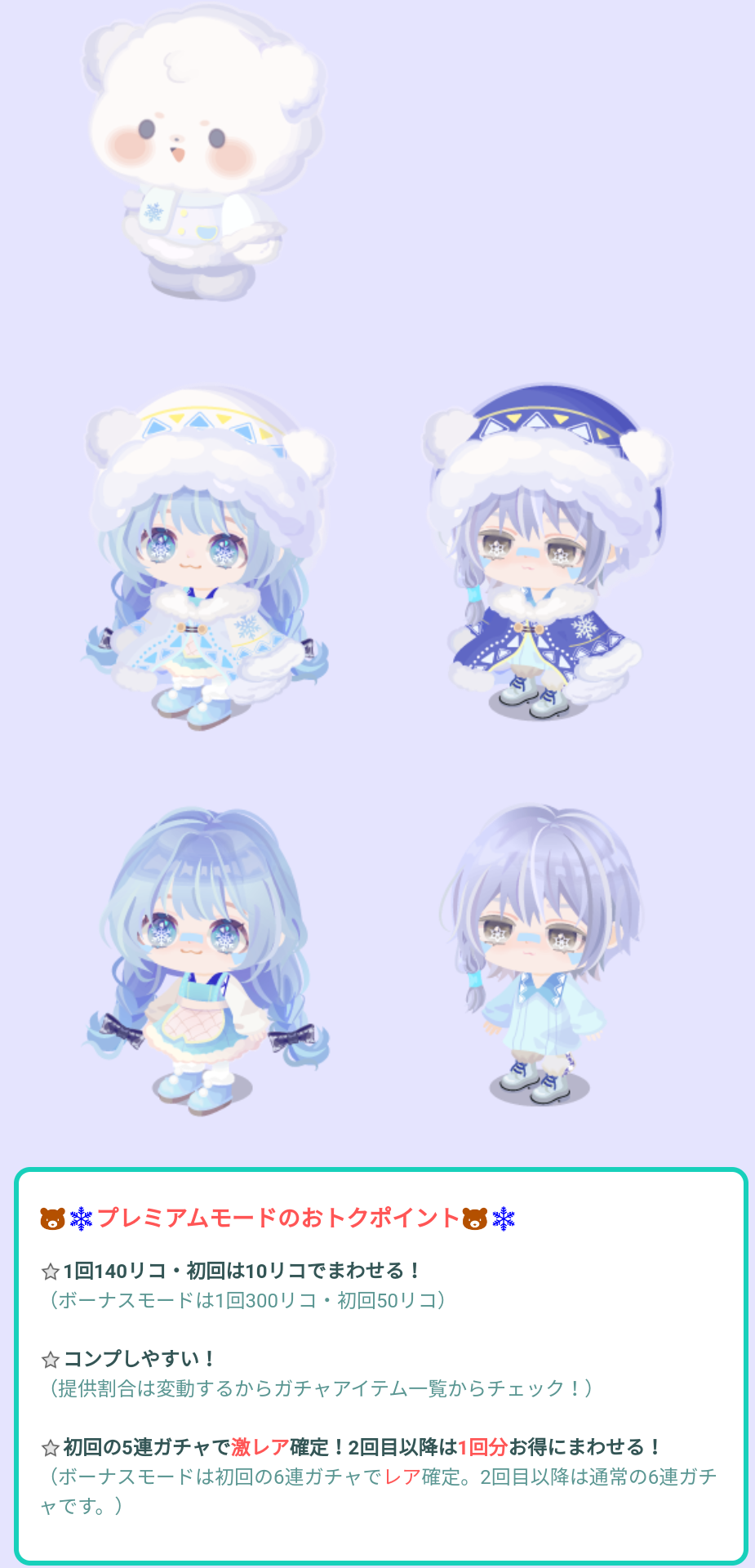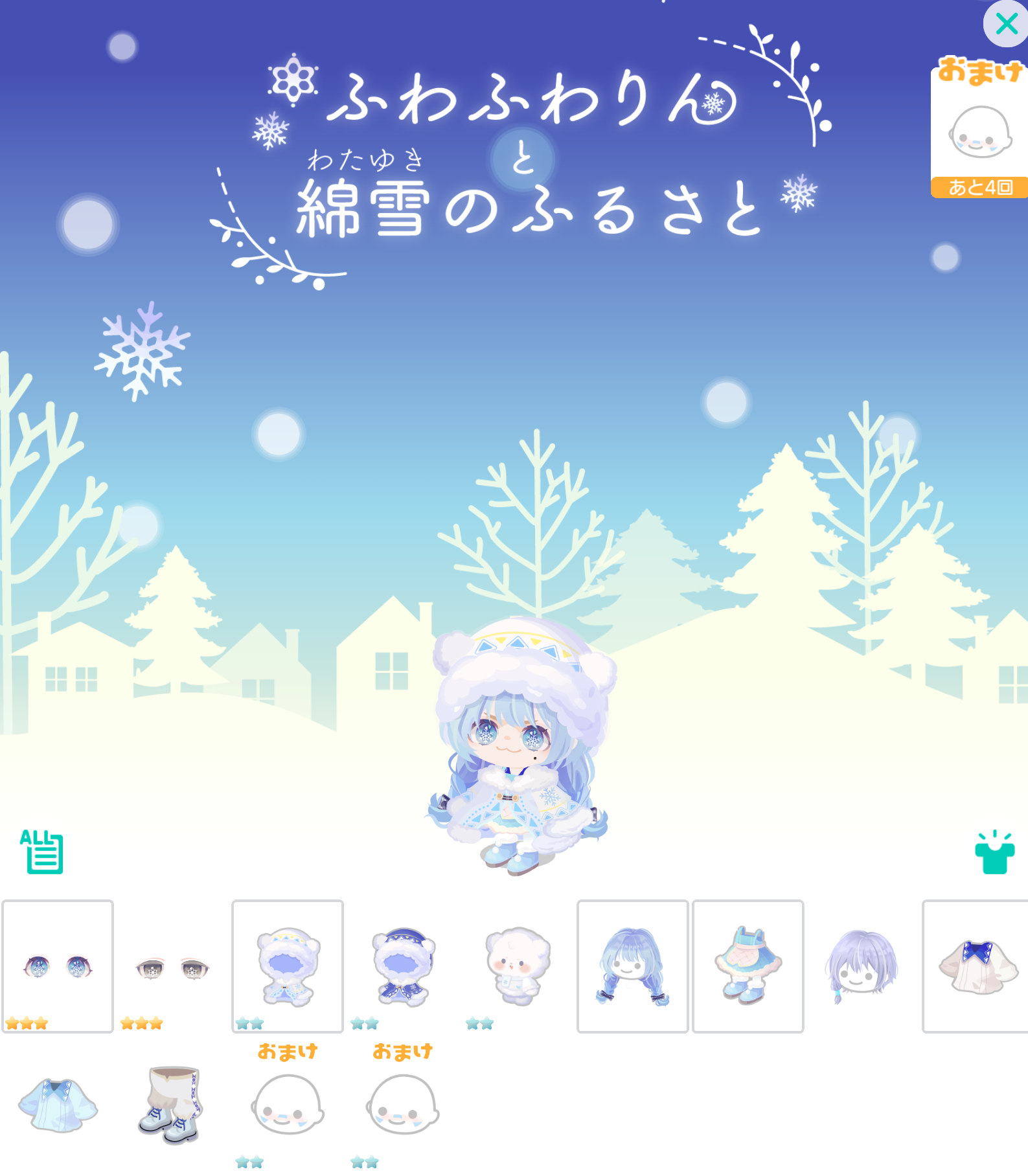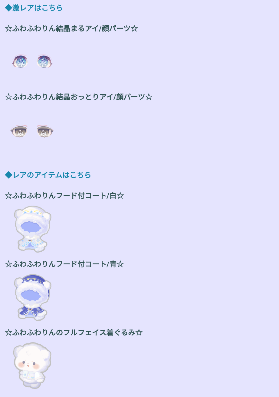 こちらではイベントクエストの【ボーナスOKガチャ横断!コーデ相性占い♡】と連動したパっと見良さそうに見えるけどよくよく考えてからぶん回すかを検討したい有料無料選択ガチャより「ふわふわりんと綿雪のふるさと」が登場したので記録していきますね(^_-)-☆
