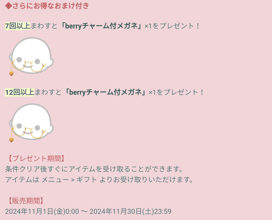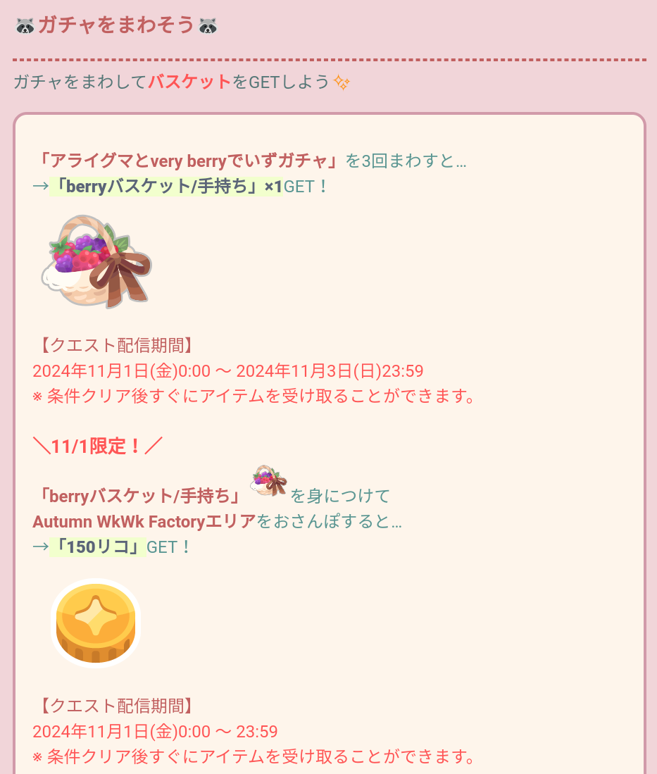 下記内容のガチャを3回回すことでberryバスケット/手持ちが貰えるのでこれを身に着けること