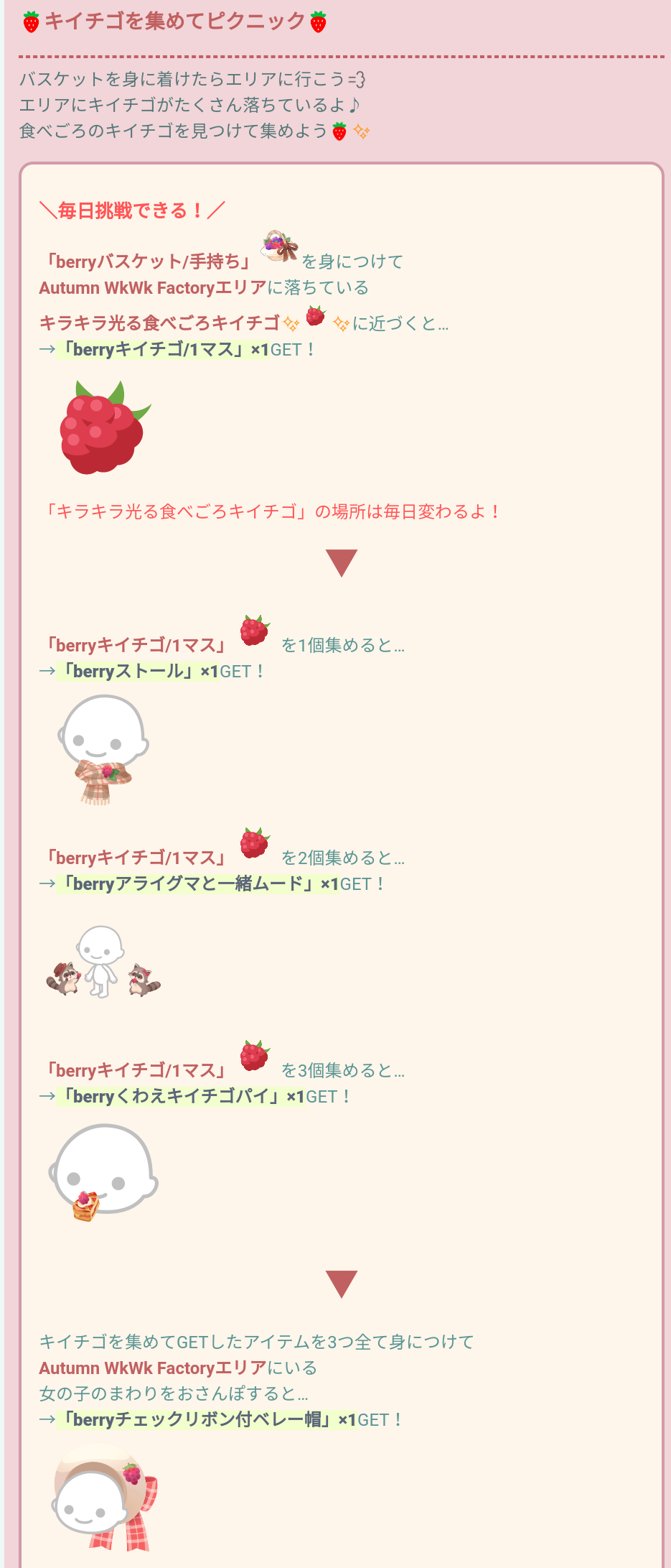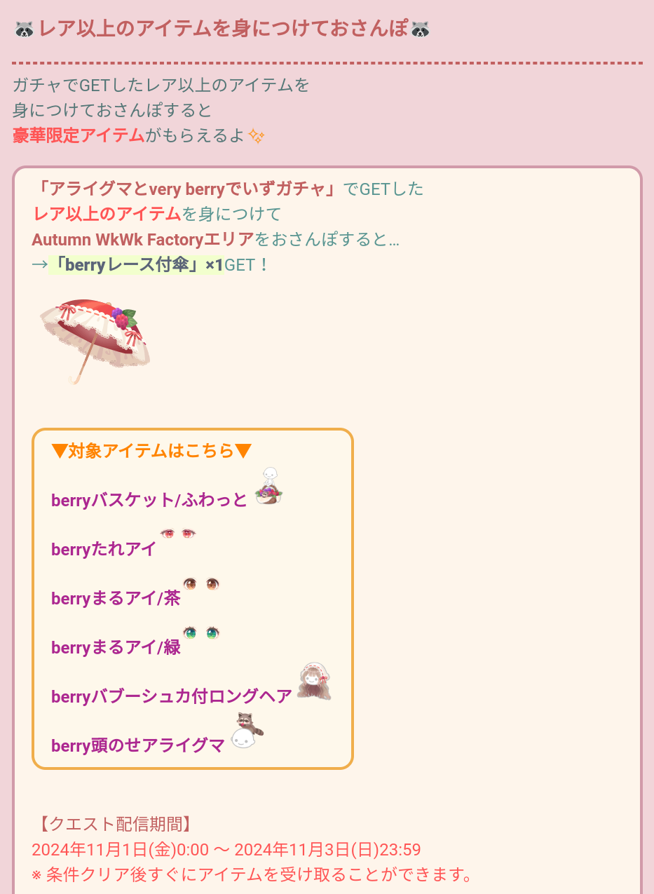 おなじように身に着けてエリアをおさんぽすることでberryレース付傘が貰えるんだけど…