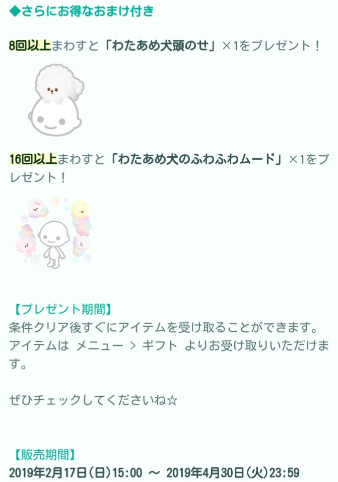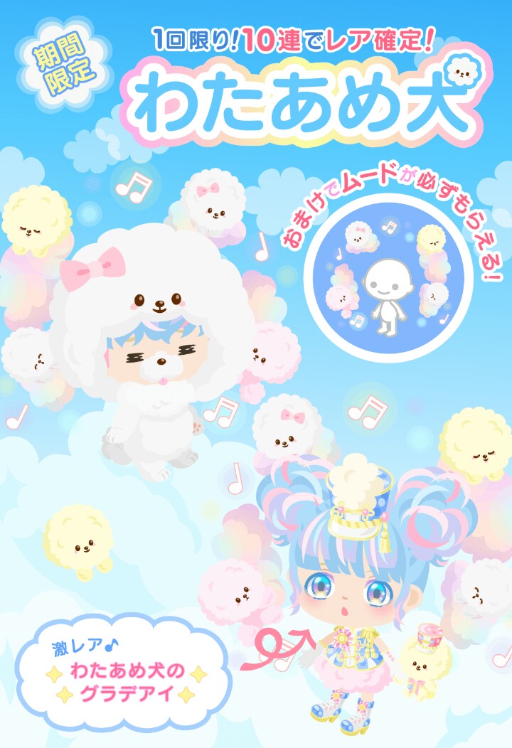 はいwそんなこんなで今回は前座の愚痴とは全く関係なく期間限定の無料リコで引ける「わたあめ犬」ガチャが登場しました(=゚ω゚)ノ