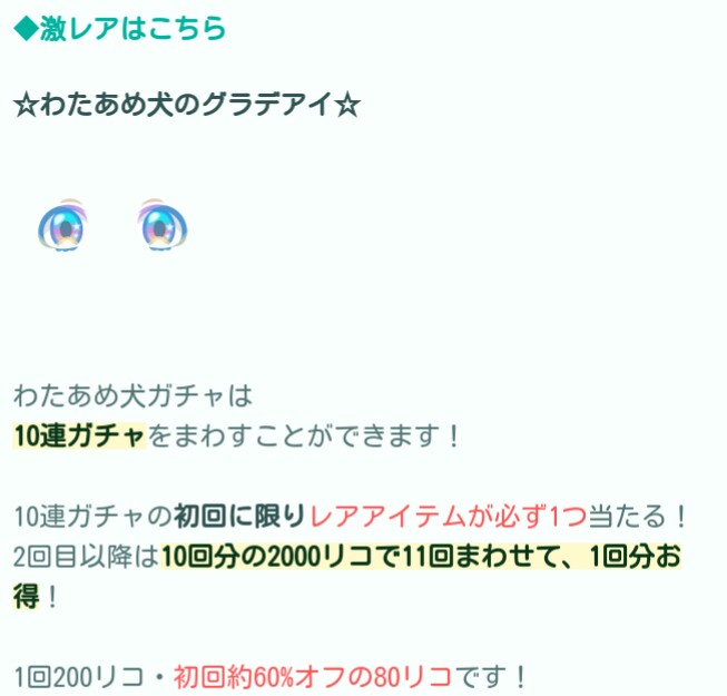 最初だけ80リコと100リコを切るくらいぱっと見待遇良いやん♪って思うけどホントに欲しいかどうか、をしっかり見極めないとここ連日で毎日ガチャやショップが登場しているので「あ…リコがなくなった」とかにならないようにしないと肝心な時に使えるリコがなくて困り果てるという自体になりかねないので注意しましょう(;^ω^)