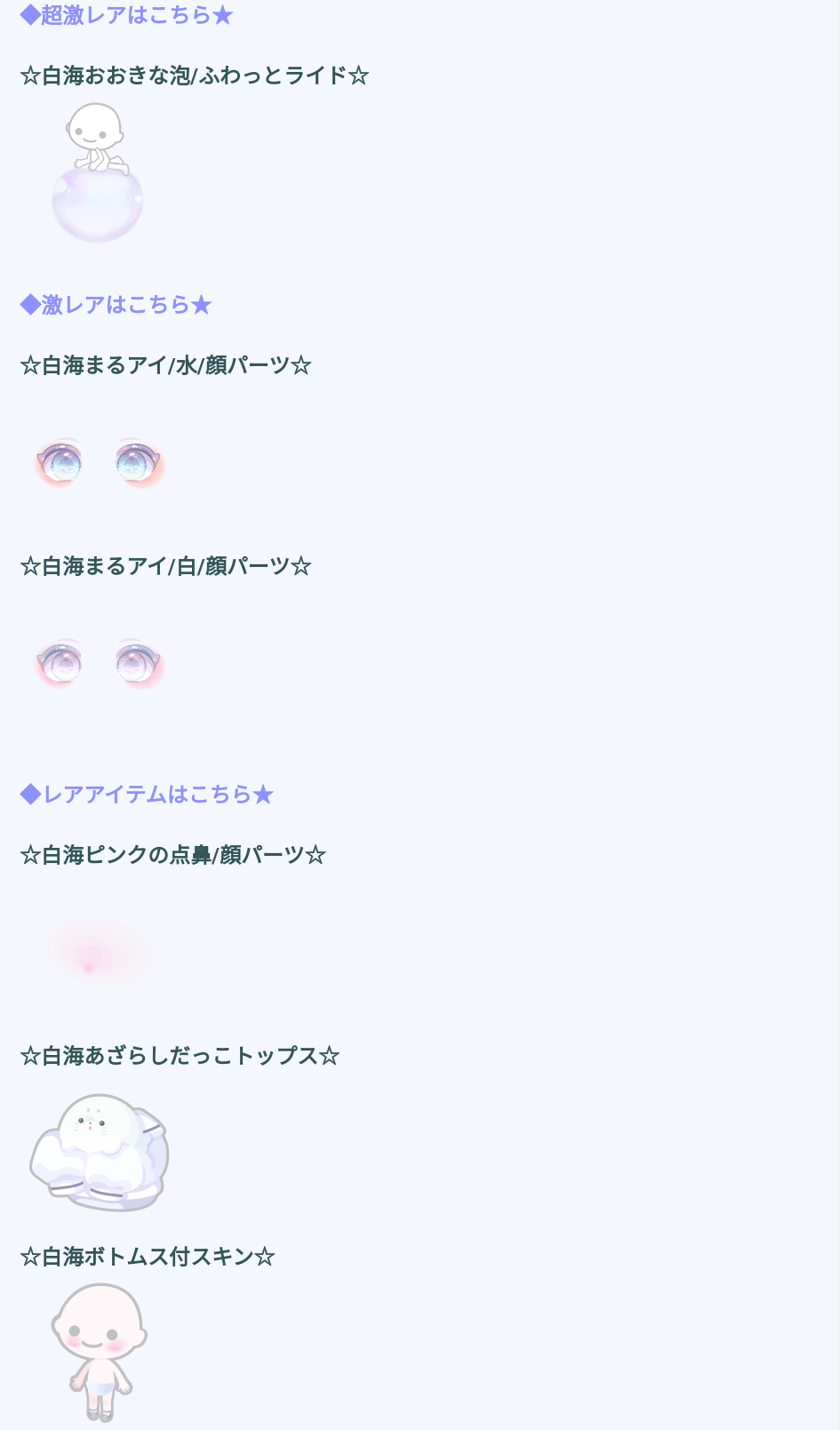 レア設定になると、逆に珍しい内容として鼻パーツに変形シリーズではないんだろう抱っこトップス、そしてボトムス付スキンの3種類となっていて初回の連ガチャでどれかが貰えるっていう意味では〇なんだろうなぁって感じですね(ΦωΦ)シランケドw