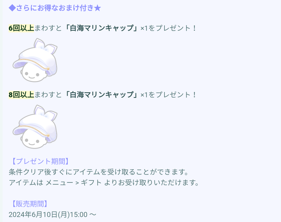 そしてそれに拍車をかけたように8回目で更に2個目のマリンキャップが手に入るということなので2回分の連ガチャが必須になるというこちらも微課金ユーザー泣かせなおまけ内容に愕然としてきますね( ゚д゚)タシカニ