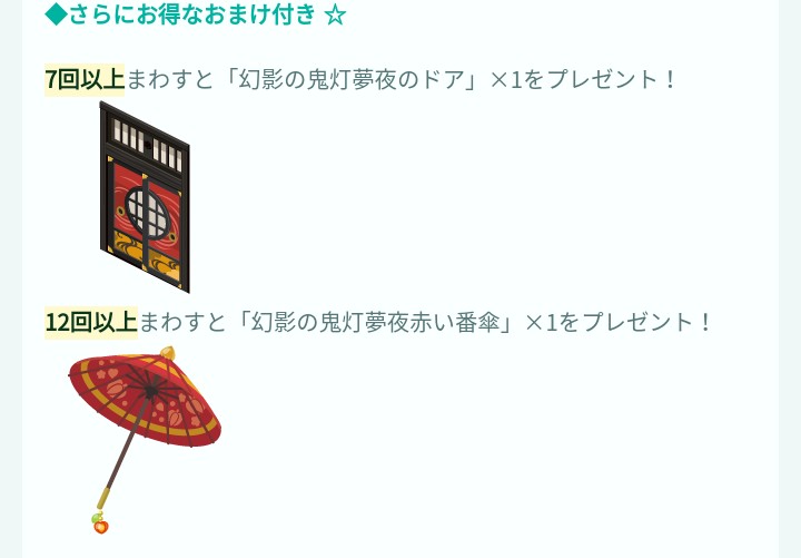 12回目の傘は背負い的な感じのアイテムで、部屋の内装アイテムではないので結構重要かもしれませんね。