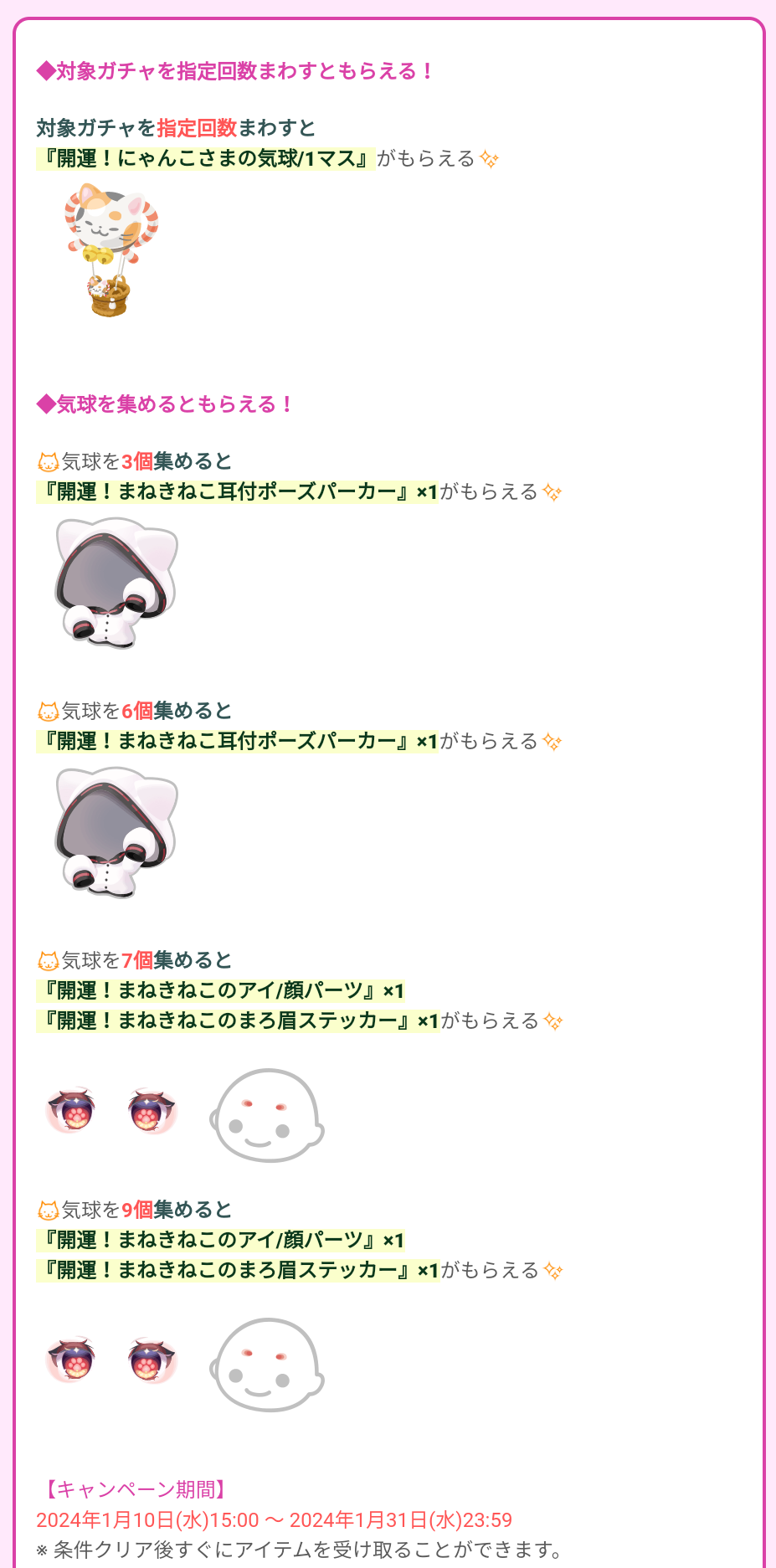 内容自体は【開運!にゃんこさまの気球/1マス】というもようがえアイテムを集めていく事でパーカーから始まり最終的には眉ステッカーと顔パーツの目が貰える内容となっているようです(´ー`*)ウンウン