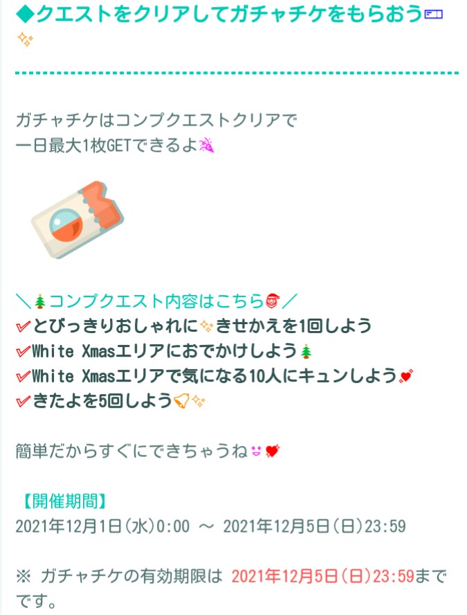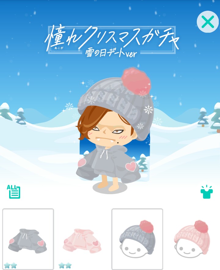 こちらでは日々のイベントクエストと連動してガチャチケ限定でのガチャとして「憧れクリスマスガチャ 雪の日デートver」が登場したので記録していきますね(^_-)-☆